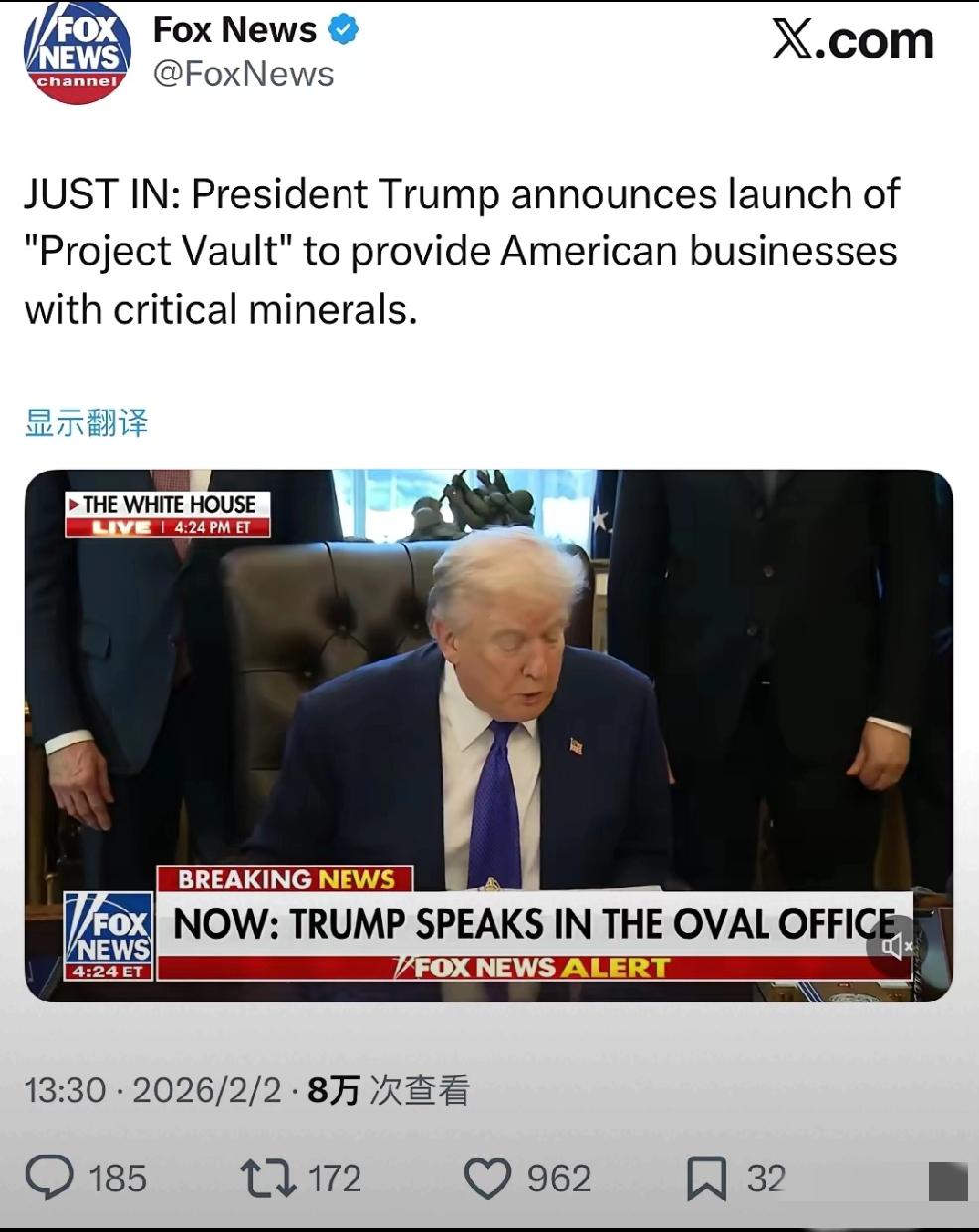 2026年2月2日,福克斯报道:美国特朗普正式宣布,启动名为“金库计划“的120亿美元关键矿产储备计划。该计划意在建立,美国首个面向私营部门的战略矿产储备,以减少对外界(特别是中国)关键原材料的依赖。保障汽车,国防和先进技术领域的供应链安全。 个人认为:针对近期的日本深海挖泥,准备向全球供应“日式稀土”,改变日本供应链的现状,降低依赖。 日本瞎搞稀土,成本高昂;美国乱搞稀土,准备储备。真是美日同盟,步调一致。 个人认为:战术上应该重视,战略上应该藐视。 针对全球稀土供应这一核心话题,美日两国每年都要口嗨几次,可是实际结果却是打脸,而且这种情况持续了许多年。 美日“口嗨”的目的就是为了争夺选票,而不是为了真正实质性的解决稀土供应。