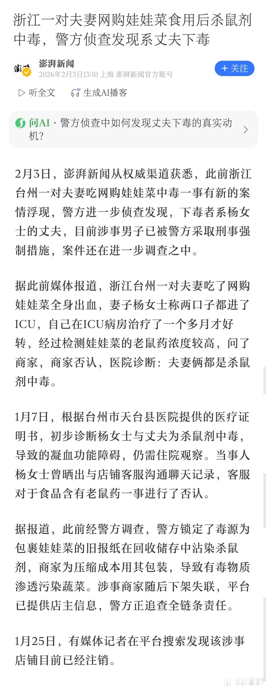 夫妻网购娃娃菜食用中毒系丈夫下毒