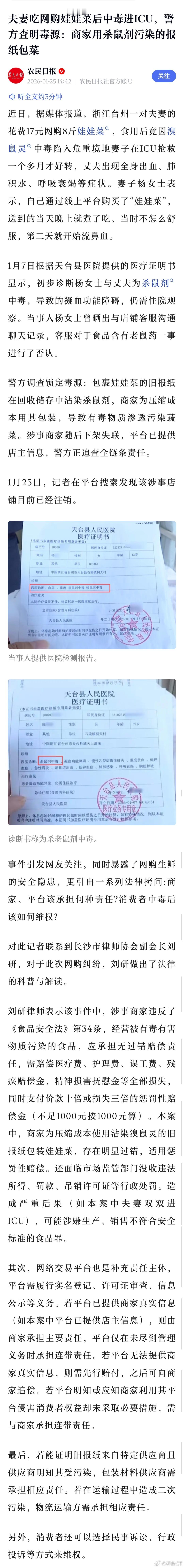根据媒体此前报道,警方当时通过调查锁定毒源:包裹娃娃菜的旧报纸在回收储存中沾染杀鼠剂,商家为压缩成本用其包装,导致有毒物质渗透污染蔬菜。