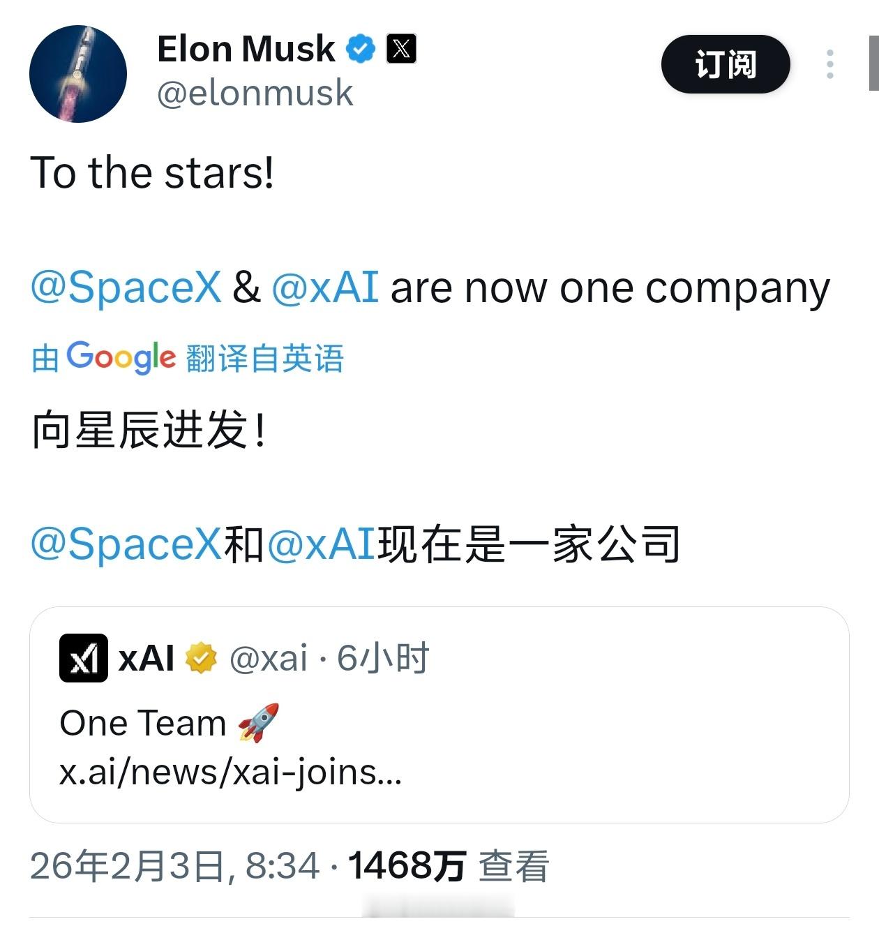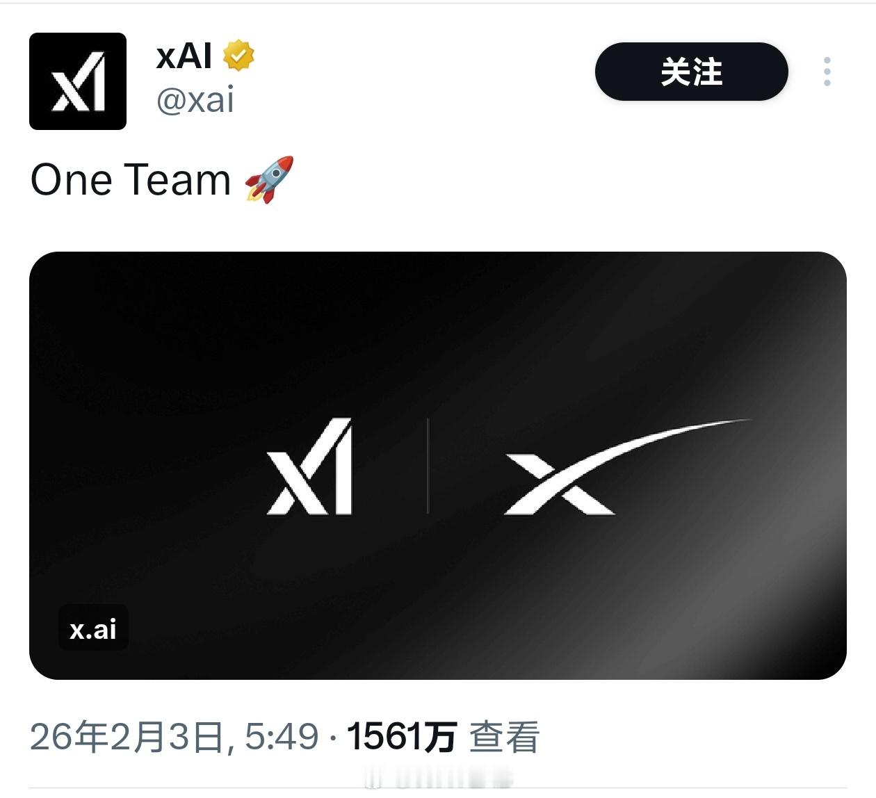 马斯克宣布 SpaceX 完成对 xAI 的收购,正式合并为一家公司。
