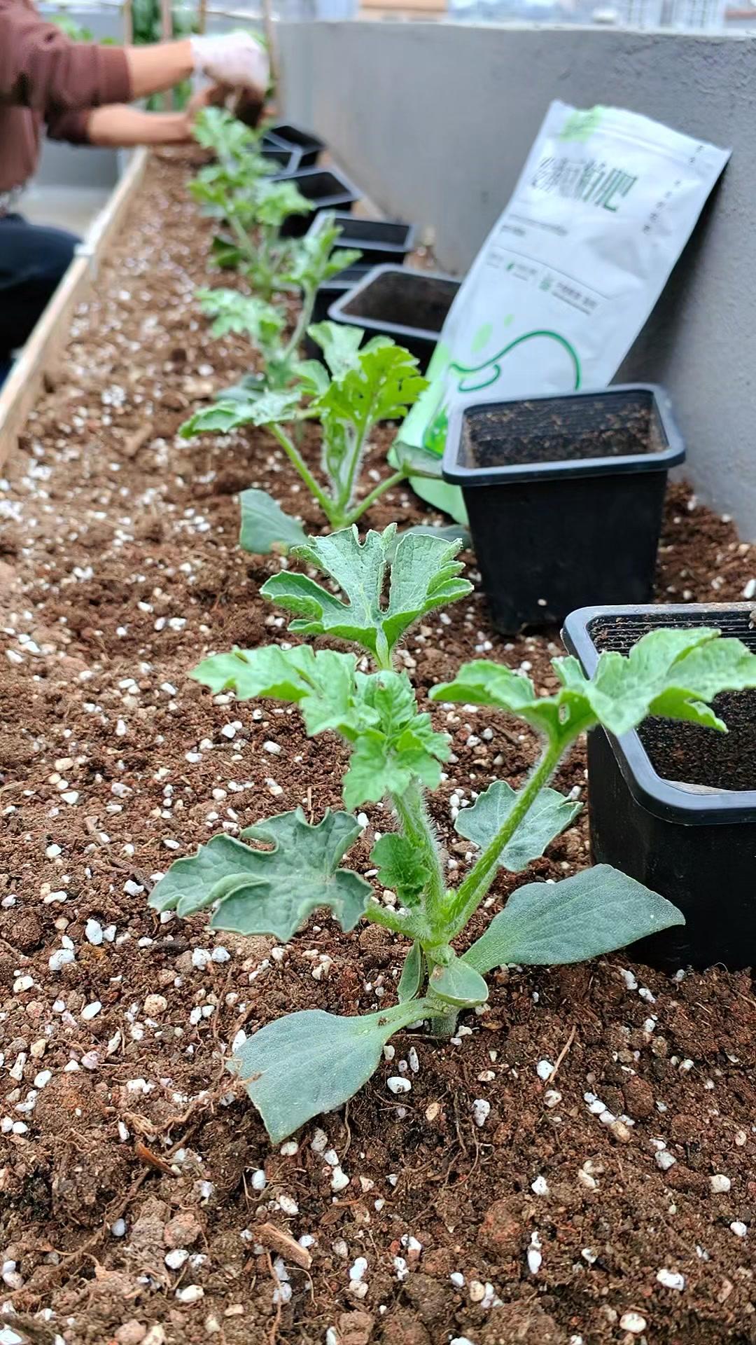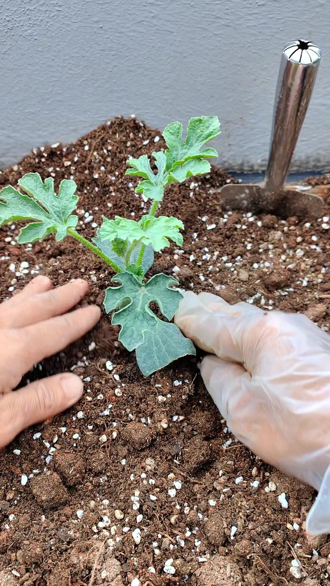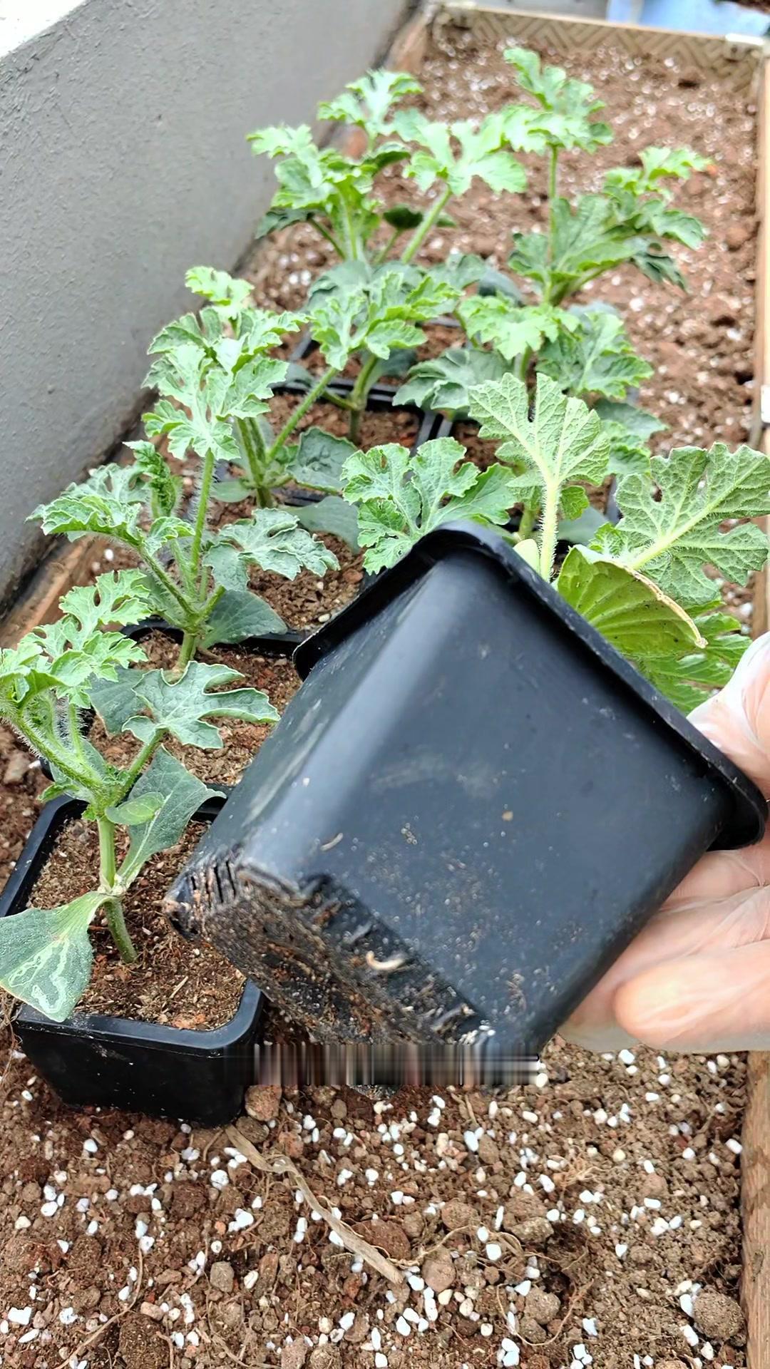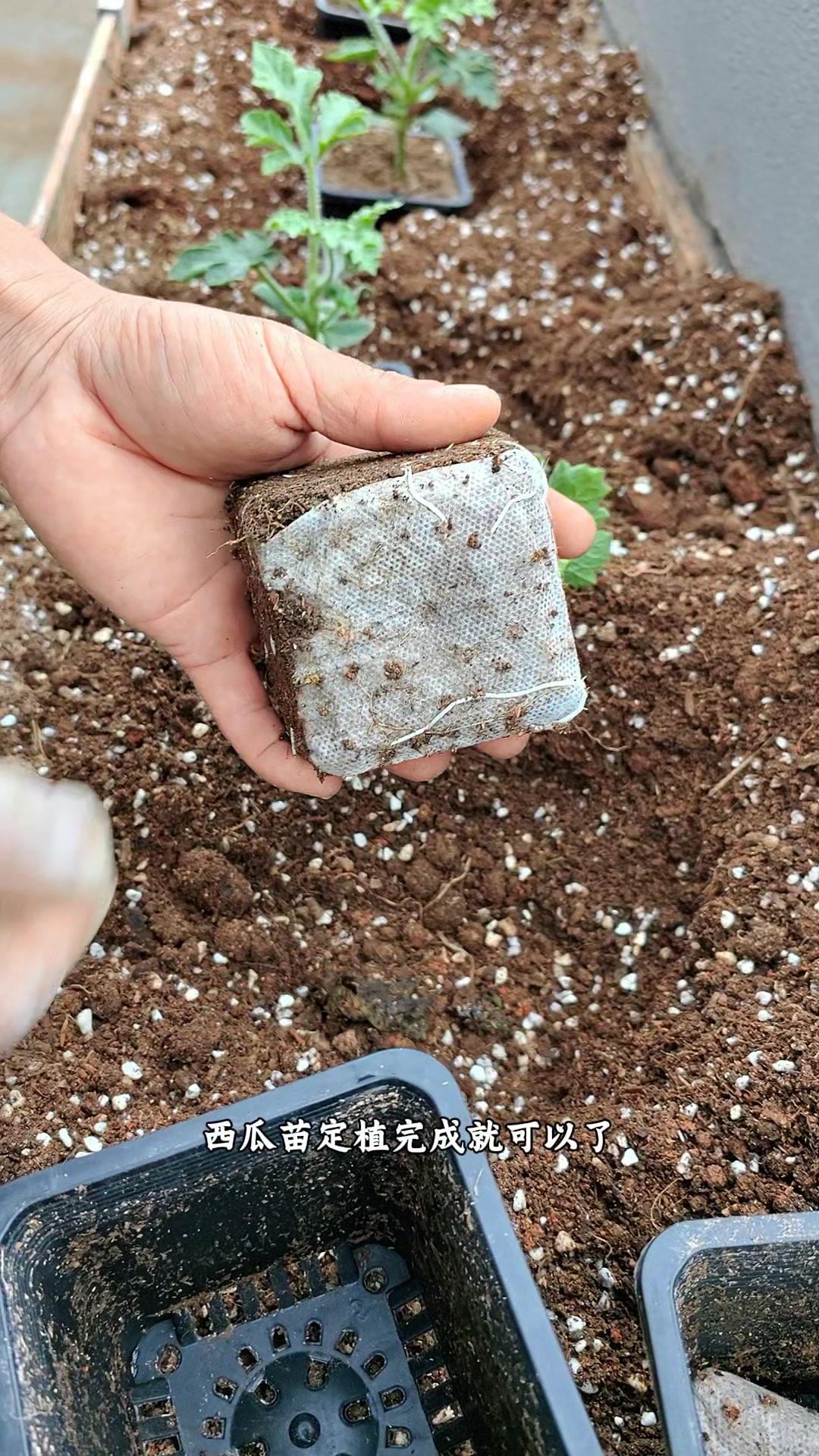 阳台种西瓜全攻略!从育苗到定植超简单~🌱育了一个月的西瓜苗根系都长到盆外了,赶紧移到3米2的大箱子里,这样才能长得更快。10棵苗间距30公分刚好,坑的深度要和育苗土厚度一致,不然西瓜根舒展不开。 1️⃣施足底肥:每个坑放大半把发酵好的豆粕颗粒肥,再和土壤拌匀,营养够足才能结大瓜~ 2️⃣带土移栽:苗杯底下垫块土工布防漏土,倒扣着轻轻把苗拿出来,完整带土坨移栽,这样不用缓苗,活苗率超高! 3米2的大箱子种满10棵,看着这些根系发达的壮苗,感觉很快就能吃到自己种的甜西瓜了,成就感满满~