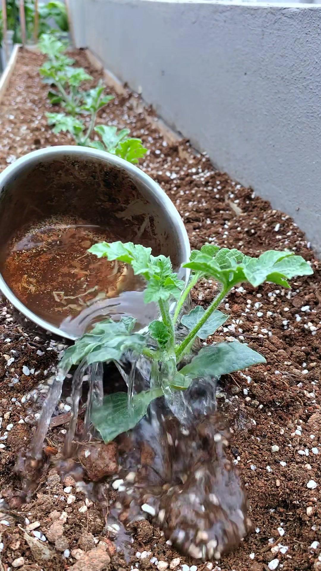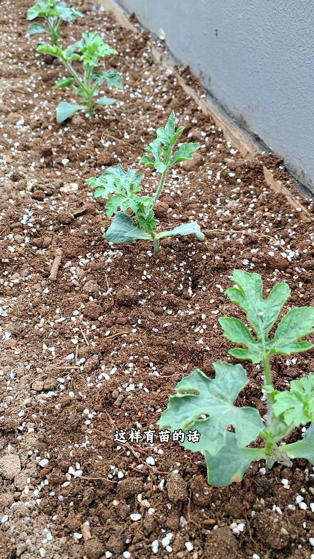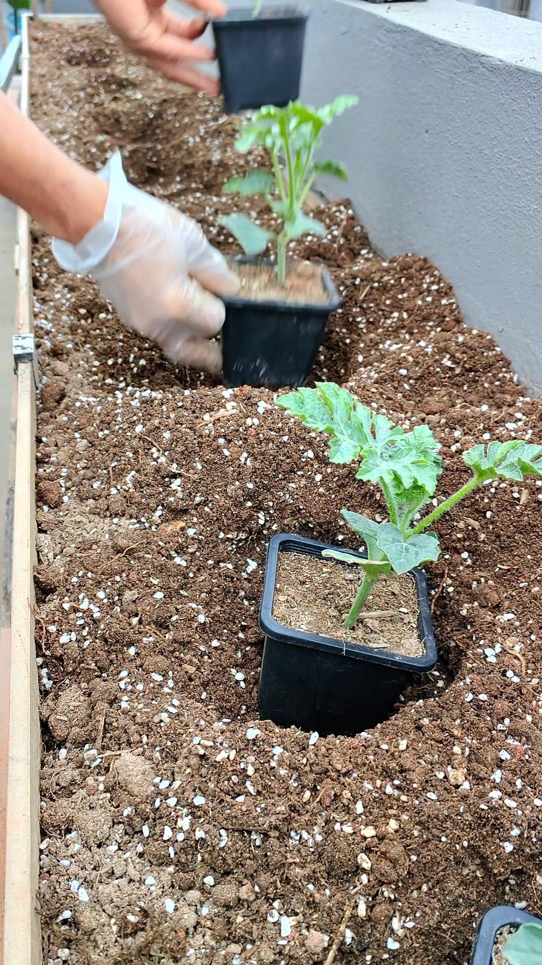 阳台种西瓜全攻略!从育苗到定植超简单~🌱育了一个月的西瓜苗根系都长到盆外了,赶紧移到3米2的大箱子里,这样才能长得更快。10棵苗间距30公分刚好,坑的深度要和育苗土厚度一致,不然西瓜根舒展不开。 1️⃣施足底肥:每个坑放大半把发酵好的豆粕颗粒肥,再和土壤拌匀,营养够足才能结大瓜~ 2️⃣带土移栽:苗杯底下垫块土工布防漏土,倒扣着轻轻把苗拿出来,完整带土坨移栽,这样不用缓苗,活苗率超高! 3米2的大箱子种满10棵,看着这些根系发达的壮苗,感觉很快就能吃到自己种的甜西瓜了,成就感满满~