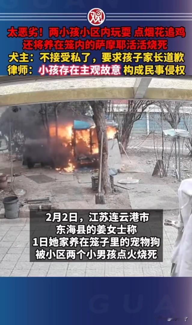 子不教父之过!说的真是不假! 图片中的父子俩便是连云港纵火烧死萨摩耶的熊孩子和他的父亲了! 这是在派出所拍下来的照片,孩子的父亲翘着二郎腿,一副满不在乎的样子,哪里像是孩子犯了错误,家长该有的态度! 看过监控视频的人,都为熊孩子的行为气得牙痒痒,因为他的一时淘气,老老实实待在笼子里的萨摩耶被活活烧死,那惨叫声让人听了真的是很难过! 狗主人养了7年的萨摩耶就这样被活活烧死了,主人拒绝两孩子家长提出的6000块钱赔偿,这也是人之常情!毕竟7年的感情! 狗主人也是心大,把狗锁在公共场所,如果养在自己家里也就不会发生这样悲惨的情况! 毕竟,孩子做错了事就要勇于承担,不能说人家把狗放在公共区域你就可以放火烧,这样的孩子还是应该要好好管教,不然以后可能会惹出更大的娄子!