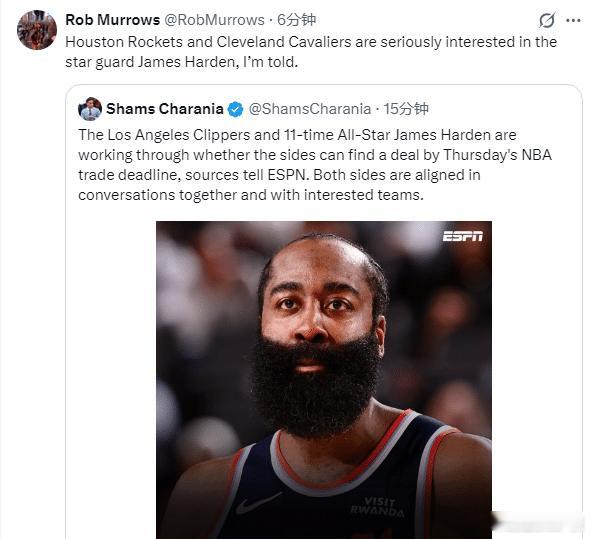 Rob Murrows报道,火箭和骑士是两支在认真考虑交易得到哈登的球队!