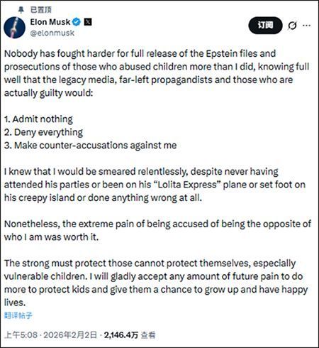 马斯克再次否认他参加过爱泼斯坦的派对,也从未搭乘被称为“洛丽塔快车”的私人飞机,也从未踏上那座“诡异的岛屿”,更没有任何不当行为。