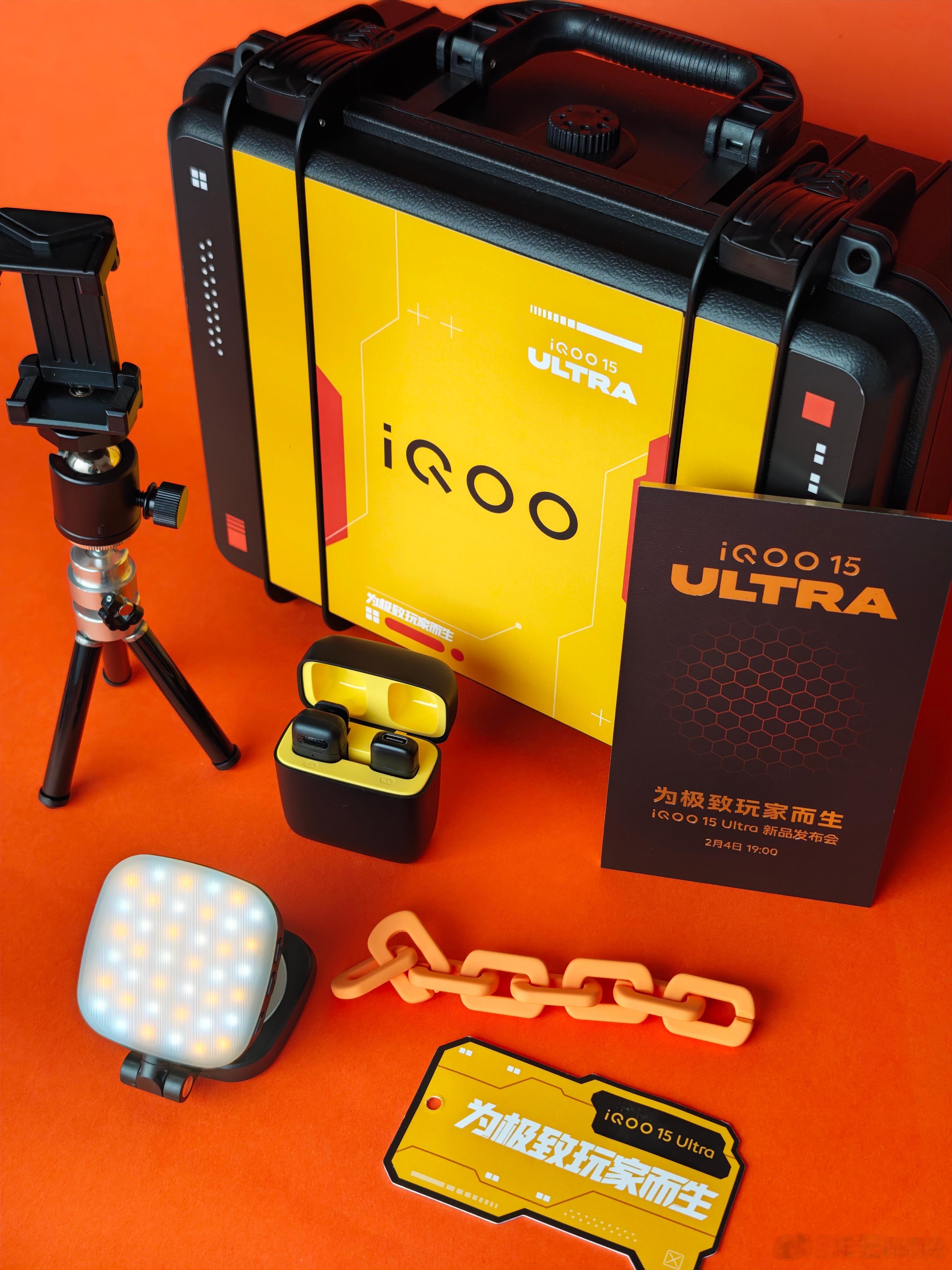 收到了iQOO 15 Ultra发布会邀请函,是一套直播套件,内含:手机支架、补光灯、无线麦。