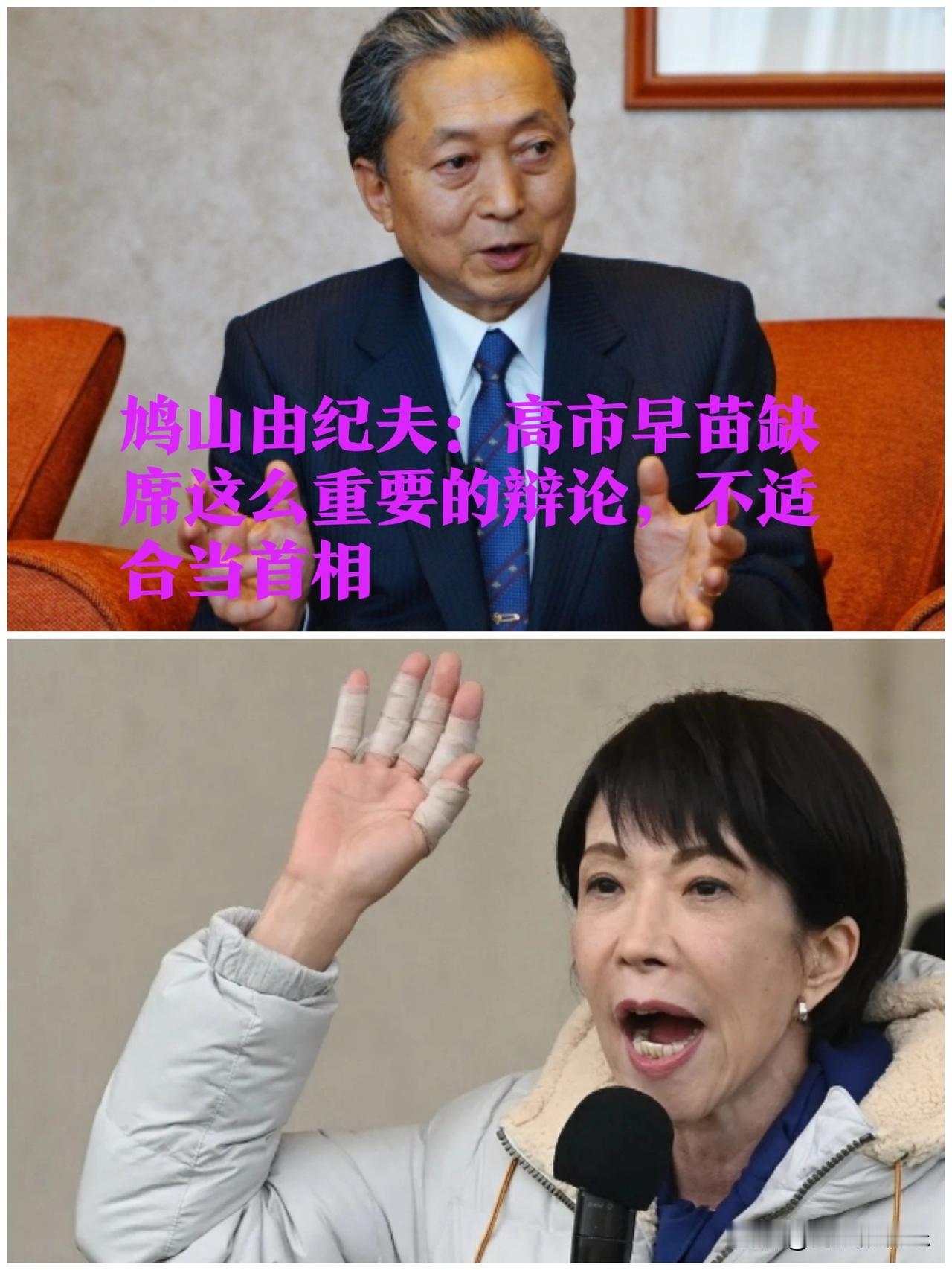 鸠山由纪夫:高市早苗缺席这么重要的辩论,不适合当首相 据外媒报道日本众议院选举倒计时,首相高市早苗却以受伤为由缺席了一种重要的辩论,日本前首相鸠山由纪夫称高市早苗不适合当首相。 鸠山由纪夫2月2日在社交媒体X上发文说:“毫无疑问,高市首相之所以没有出席NHK的‘周日辩论’,是为了避免因其对原统一教会、秘密资金和外汇特别委员会的言论而受到批评。既然她之后还外出出席了助选活动,如果她加快治疗,就应该能够参加辩论节目。我认为,回避这场对民众而言最重要的辩论的人,不适合担任首相。” 1月27日,日本首相高市早苗正式公布众议院选举日程:2月8日,日本选民将前往投票站,参与这场突如其来的提前大选。此次选举距上届仅过去1年3个月,从众议院解散到投票日仅16天,创下战后日本政治史上“最短间隔”的纪录。 分析认为,高市早苗试图借当前尚可的民意支持率,通过胜选打造稳固的执政基本盘,为长期掌权铺路。“我希望由日本民众直接决定,我是否应该继续担任首相。” 1月19日的记者会上,高市早苗宣称,“我将首相之位押在这场选举中。”4天后,众议院议长额贺福志郎宣读解散诏书,日本众议院正式解散。 2月1日上午,高市早苗突然取消了原定在NHK“周日辩论”节目中的亮相。自民党当时向节目组解释说,高市早苗在1月31日的竞选活动中手臂受伤,目前正在接受治疗。 辩论节目播出后,高市早苗在其X上发文说,“过去几天,我在竞选活动中与一些热情的支持者握手时,不小心拉伤了手,他们拉得太用力了。我患有类风湿性关节炎,手肿了起来。医务人员很快过来帮我涂药并包扎好。” 不过,高市早苗1日晚些时候在岐阜和爱知两地为自民党候选人发表的竞选演讲照常进行。她还向支持者展示了自己受伤的手。她解释道:“昨天握手的时候被用力拉了一下,关节受伤了。通过一些治疗后没什么问题了。” 高市的此次缺席辩论引发在野党方面强烈不满。令和新选组共同代表大石晃子表示,她原计划在节目中就涉原统一教会相关情况当面向高市提出质询,但因高市缺席未能实现,要求高市“在投票日前向国民作出说明”。 日本共产党委员长田村智子同日表示,自己在节目开始前约30分钟才得知高市将缺席,节目组也一度“陷入混乱”。她质疑称:“选举期间党首公开讨论机会本就有限,高市连讨论都不参加,还想让民众对她投下信任票吗?”