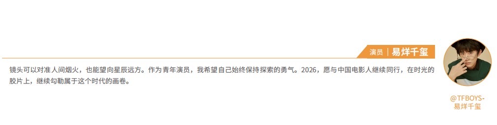易烊千玺希望始终保持探索的勇气易烊千玺寄语 金鸡奖、戛纳、百亿票房,易烊千玺的演艺成绩单愈发亮眼。他在2026微博娱乐白皮书中寄语同行:“2026,愿与中国电影人继续同行,在时光的胶片上,继续勾勒属于这个时代的画卷。”他以探索守初心,以热爱赴山海!微博娱乐白皮书