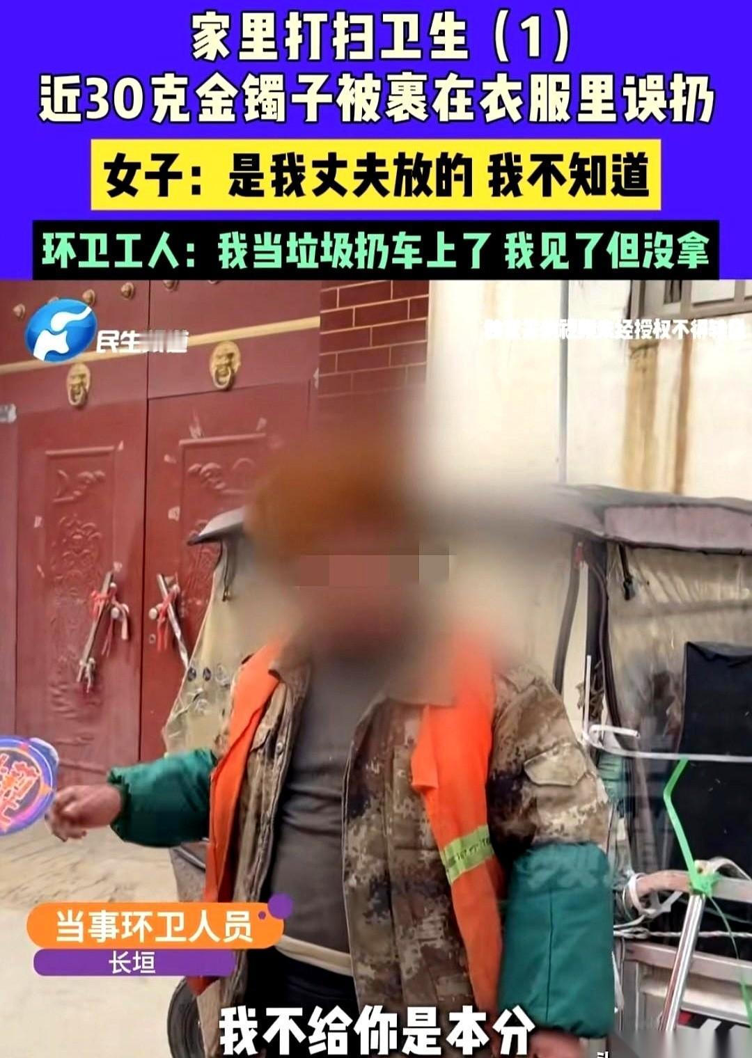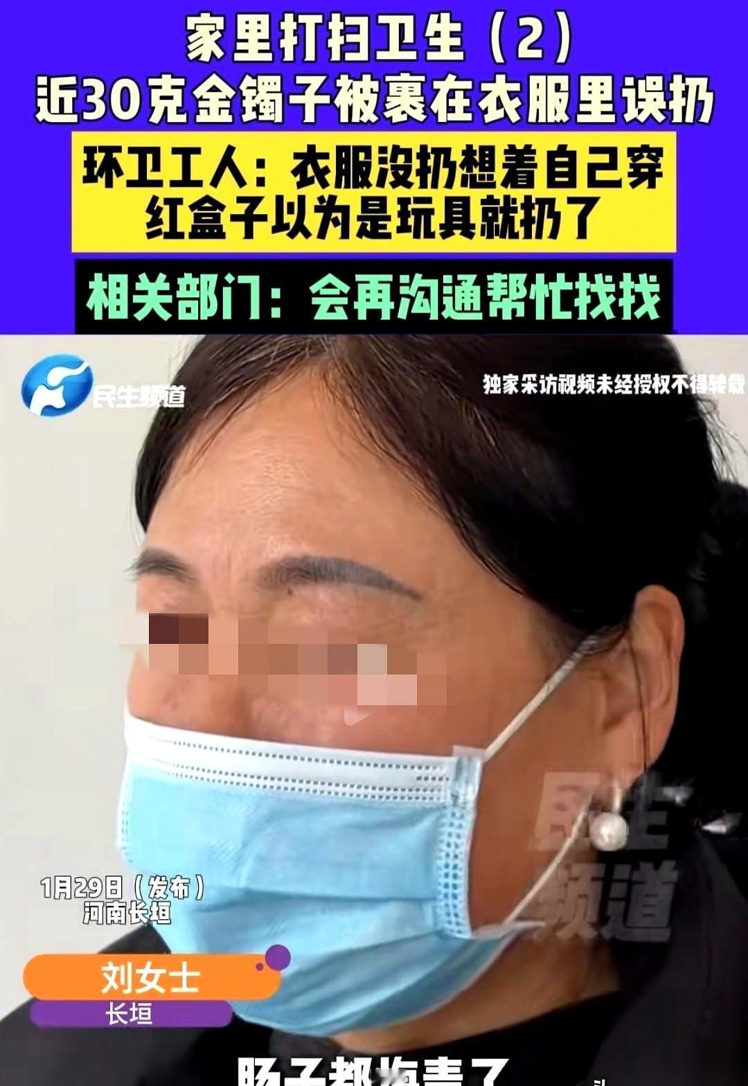 [微风]肠子都悔青了!河南长垣,女子大扫除时扔了一件迷彩服,几天后,发现26克金手镯不见了,丈夫说金镯子放迷彩服里了,女子又气又急,赶紧去找收走衣服的环卫大爷,可大爷说:衣服我留着穿了,但没看到金手镯,有个红盒子以为是玩具,就当垃圾扔了。   河南长垣那个垃圾焚烧站,炉子里到底多少度,普通人其实说不出准确数字,但有一点可以肯定,只要东西真进了那里,基本就没回头路了。 说白了,这事儿从一开始,就不是在比谁能把东西找回来,而是在逼人接受一个已经无法逆转的结果。 事情偏偏发生在最容易出事的时候,春节前的大扫除。河南长垣的刘女士看着家里一件旧迷彩服碍眼,顺手就扔到了门外。 在那一刻,她只是觉得清理杂物,压根没想到,这个动作相当于亲手把一笔家里的重要财产送上了“终点站”。 更要命的是,她当时并不知道,那件衣服的兜里,装着女儿的金手镯,是实打实的嫁妆,也是将来能换成现金的硬货。 直到几天后,她才突然反应过来那只手镯不见了,可这一觉醒得太晚了,三四天的时间,几乎决定了一切。 对普通人来说,这是几天,但对垃圾处理系统来说,已经足够完成一整套流程:清扫、装车、转运、压缩,最后送进焚烧炉。 就在刘女士和家里人急得团团转、互相埋怨、跑出去找人的时候,那只金手镯,很可能已经在上千度的高温里被融得面目全非了。 真正让人情绪崩溃的,还不是钱可能没了,而是后来找到负责那一片的环卫大爷时,对方说的话。 那一刻,事情一下子变得复杂起来,大爷很坦诚,直接说那件迷彩服他确实看见了,而且衣服还挺新,就留下来,打算天热干活的时候穿。 这句话一出口,刘女士心里立刻燃起了希望:衣服没烧,那兜里的东西是不是也还在? 可紧接着,大爷又说了一句更要命的,他说,衣服兜里确实有个红色的小盒子,但他以为那就是个空盒子,或者小孩玩的塑料盒,当垃圾顺手就扔掉了。 这一下,刚冒出来的希望,瞬间被浇了个透心凉。 冷静想一想,如果这个大爷真的动了歪心思,想把那将近30克的金子据为己有,最省事,也最安全的做法是什么? 其实很简单,就是干脆否认,说什么都没看见,衣服早就当垃圾处理了。 反正没有证据,谁也拿他没办法,可他偏偏承认自己留下了衣服,这种为了占件旧衣服的小便宜,反而把自己推到风口浪尖上的做法,从逻辑上看,恰恰让“没拿金子”这件事更像是真的。 要是真想吞下那点金子,完全没必要多此一举。 但站在刘女士的角度,她根本没法接受这个解释。 那不是讲不讲逻辑的问题,而是心理上根本过不了这一关。 对她来说,如果金子是被人拿走了,那至少说明东西还存在,还有追回来的可能。 可要是已经进了焚烧炉,化成灰了,那就真的什么都没了。她抓住的,其实是最后一点不愿面对现实的希望。 在刘女士眼里,那是装着贵重嫁妆的首饰盒,怎么看都不可能随便扔。 可在环卫大爷的世界里,旧衣服堆里一个红色塑料盒,跟废纸,烂塑料没什么区别,就是垃圾。 逼到最后,大爷也急了,说的话虽然不好听,但也很直白:他就算真看见了,给不给是情分,不给也是本分,可问题是他真的没见过金子,就算给他再多钱,他也拿不出来。 从法律角度看,这几乎已经是个走不通的局。 你要说大爷侵占或者占了不该占的东西,前提是得证明那只手镯现在就在他手里。 但现实是,没有监控拍到他打开盒子,没有旁人作证,连那个红盒子本身都找不到了。 更关键的是,城管部门给出的信息也很明确:那批垃圾早就运到焚烧站处理了。 这意味着,最重要的物理证据已经不存在了,而且,大爷在清理垃圾时把看起来像垃圾的东西当垃圾扔掉,从工作流程上说,也很难算是严重过失。 到最后,这件事里真的没有赢家,环卫大爷平白无故惹了一身麻烦,被怀疑,被指责,心里肯定也不好受。 而刘女士一家,失去的也不仅仅是那26.43克黄金。 那个消失的红盒子,更像是在提醒他们,家里沟通有多么缺失。 丈夫随手把贵重东西藏在旧衣服里,妻子清理时不检查,两个看似普通的习惯,叠加在一起,直接造成了一次无法挽回的损失。 事情到了这个地步,再多后悔也换不回已经不存在的东西了。 毕竟金子是有价的,可日子里反复翻旧账、互相埋怨的消耗,才是最昂贵,也最难还清的代价。 信源:小莉帮忙