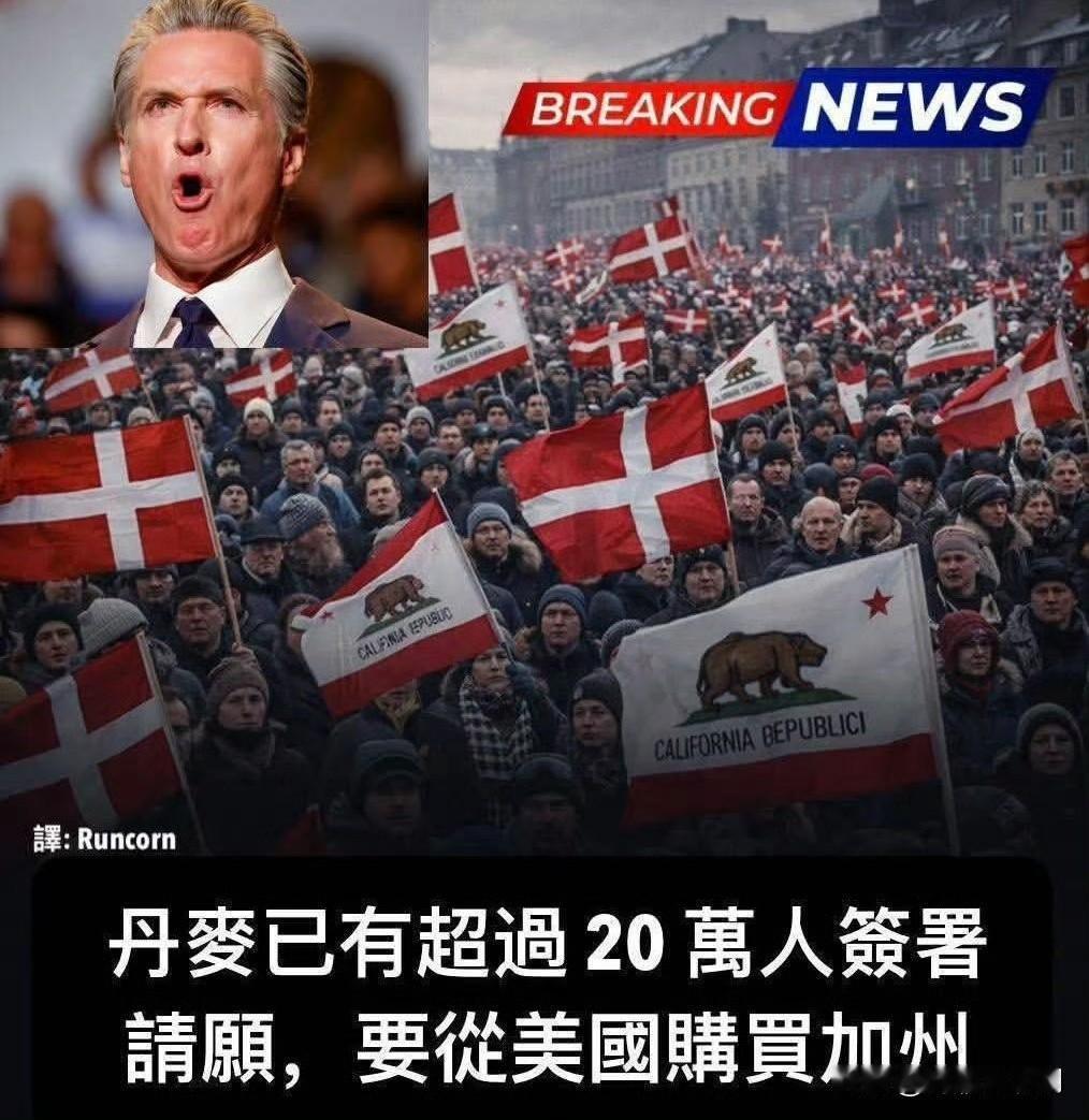 对抗美国购买格陵兰,丹麦请愿购买加州 为了抗议美国购买格陵兰岛丹麦政府的无作为行动,丹麦民间发起购买加州行动,目前已经有超过20万加入该项请愿,并且已经募集数百万元欧元的现金。 不过丹麦确定不是来搞笑的,真要是卖了加州,特朗普估计能笑死,把最大的敌人民主党老家都给卖了。