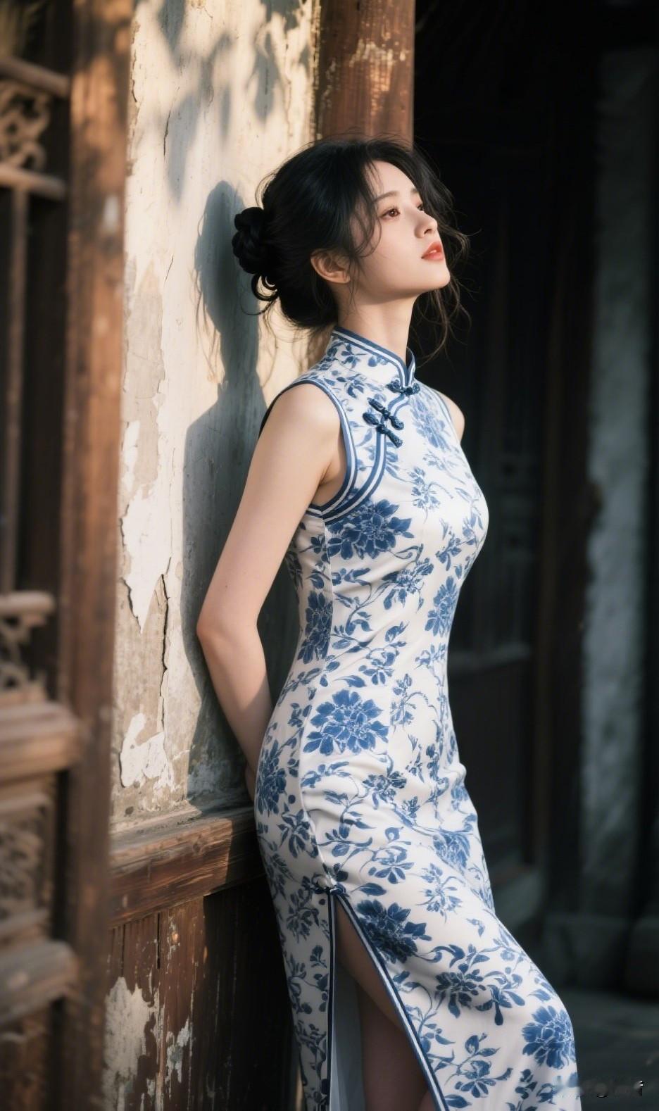 青花染韵,光影成诗 当古典旗袍遇上斑驳老墙 一袭青花诉旧梦 旗袍