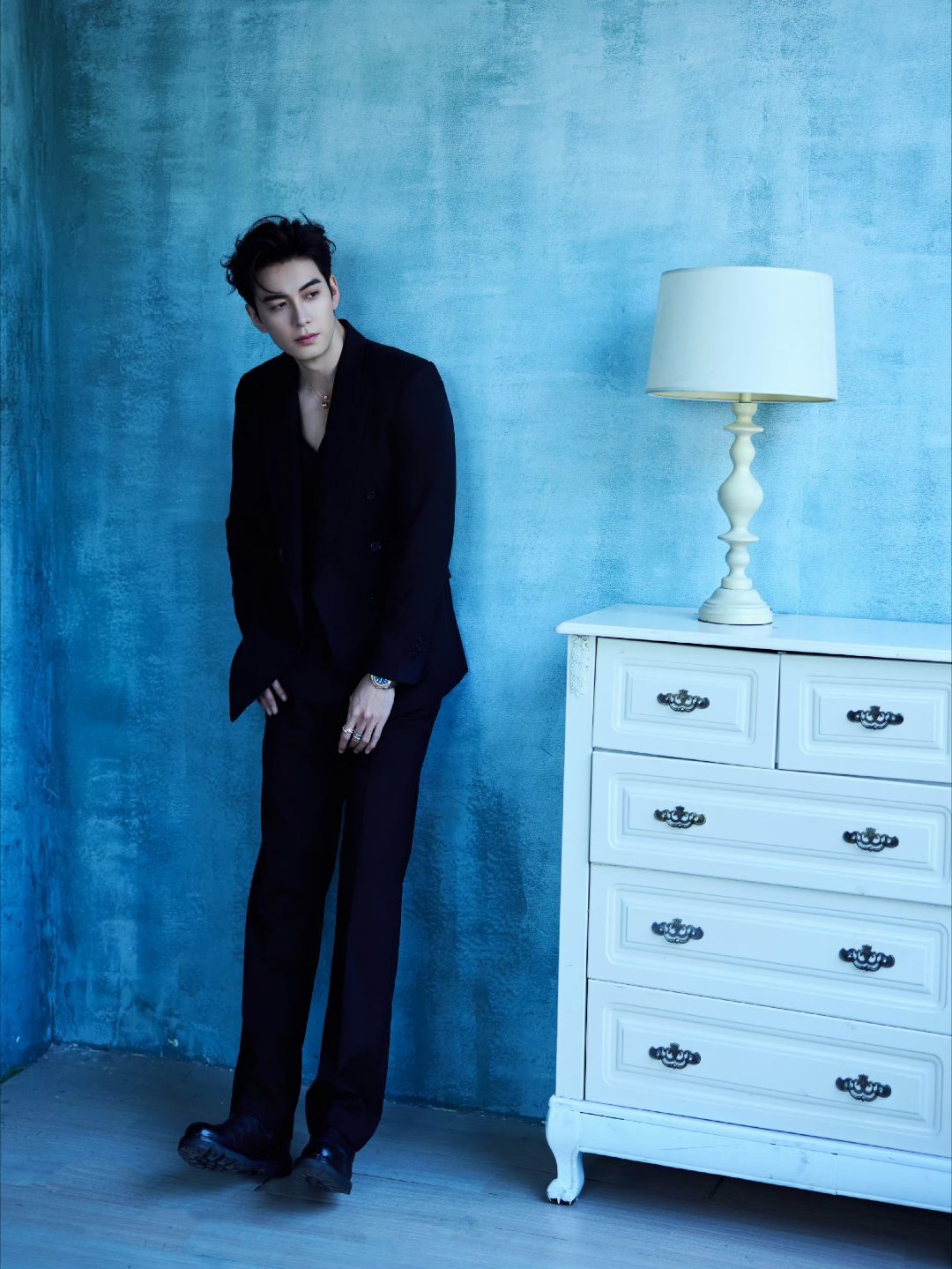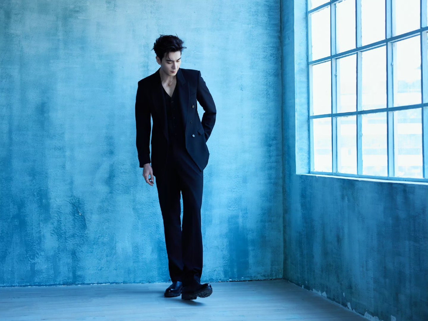 陈星旭最新造型大片释出,简约修身V领西装搭配BVLGARI珠宝腕表,置身蓝色调空间中,光影流转间勾勒沉稳气场与细腻质感。
