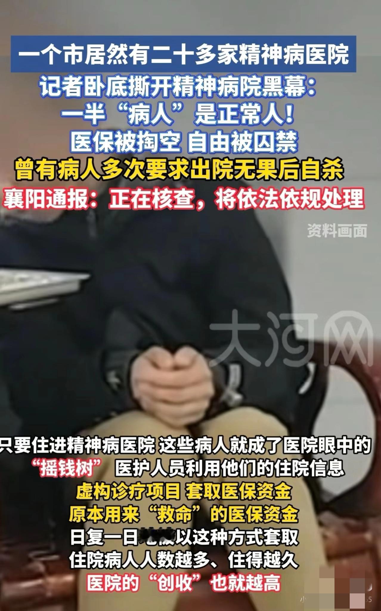 新京报这次真的是立了大功! 卧底湖北襄阳,把那个烂透了的精神病院黑幕全给掀开了。 所谓的“免费住院”,竟然是专门给穷人设的局。 襄阳宏安精神病医院的收费系统显示,一名病人在住院90天期间,尽管并未接受实际治疗,却被收费包括“心理治疗”和“行为矫正治疗”项目,治疗费用占比达到6000元。 据护工透露,每一名病人每月可套现5000,100名病人一年就能获利600万。 天眼查这涉事医院,湖北襄阳宏安精神病医院成立于2022年9月,注册资本100万元,经营范围为医疗服务。 这样的医院在湖北襄阳竟然开了20多家,一半的病人竟然还是正常人!有些病人甚至被关了八九年,直言“住院相当于坐牢”。 难怪襄阳本地工资普遍5000不到,开豪车的遍地? 襄阳精神病院 襄阳精神病院