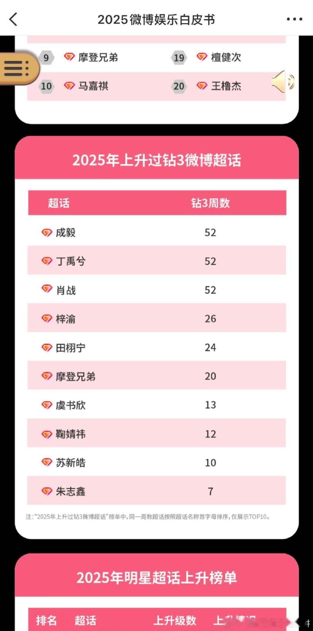 2025微博娱乐白皮书相关榜单出炉,苏新皓再次入榜,钻3周数达10周,钻3微博超