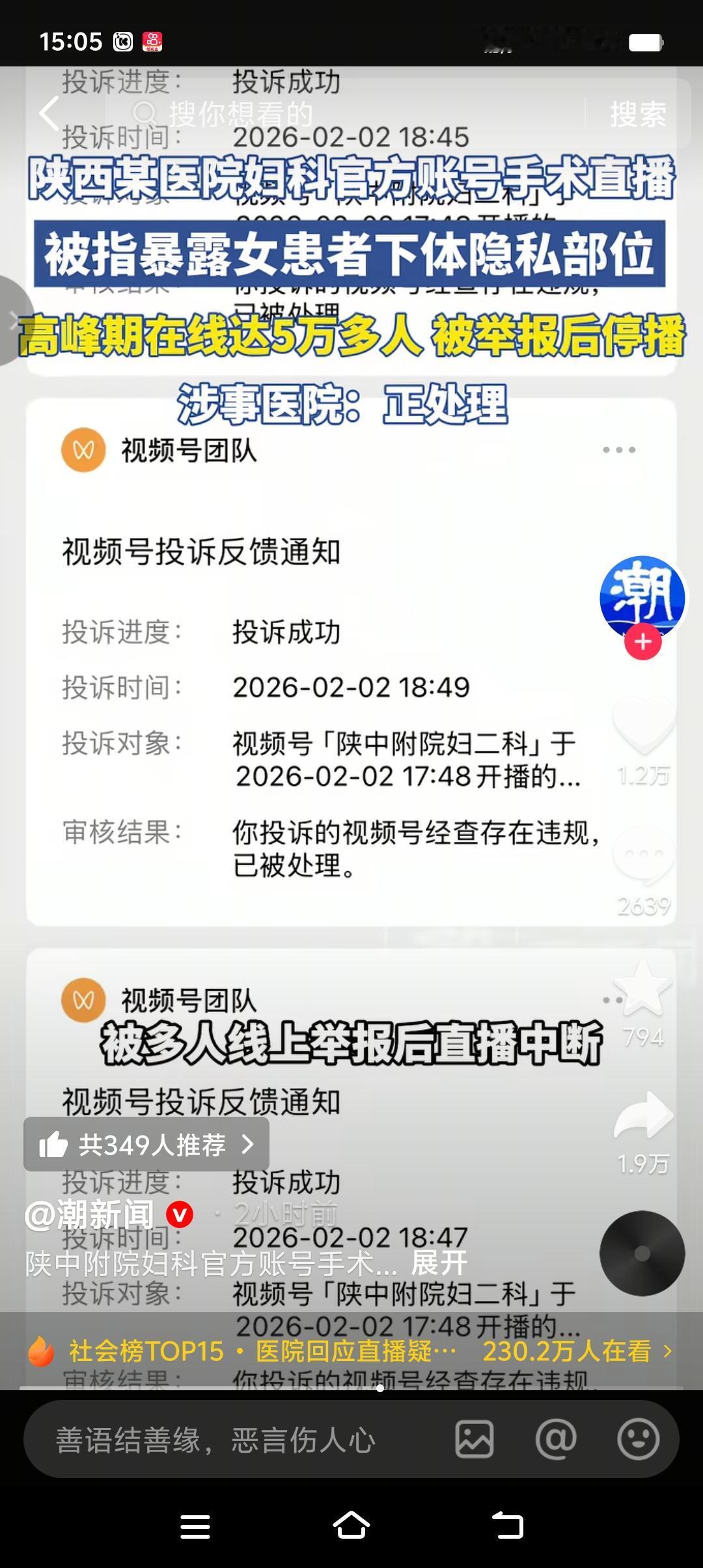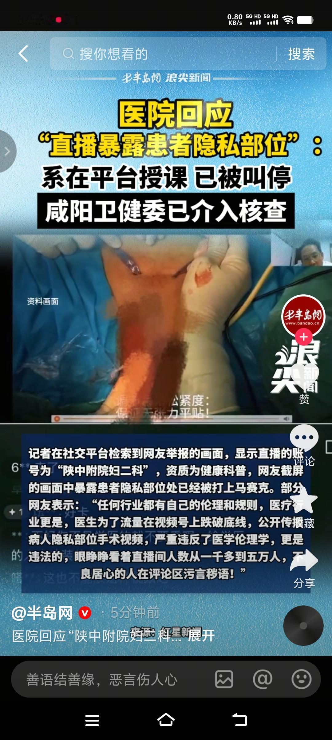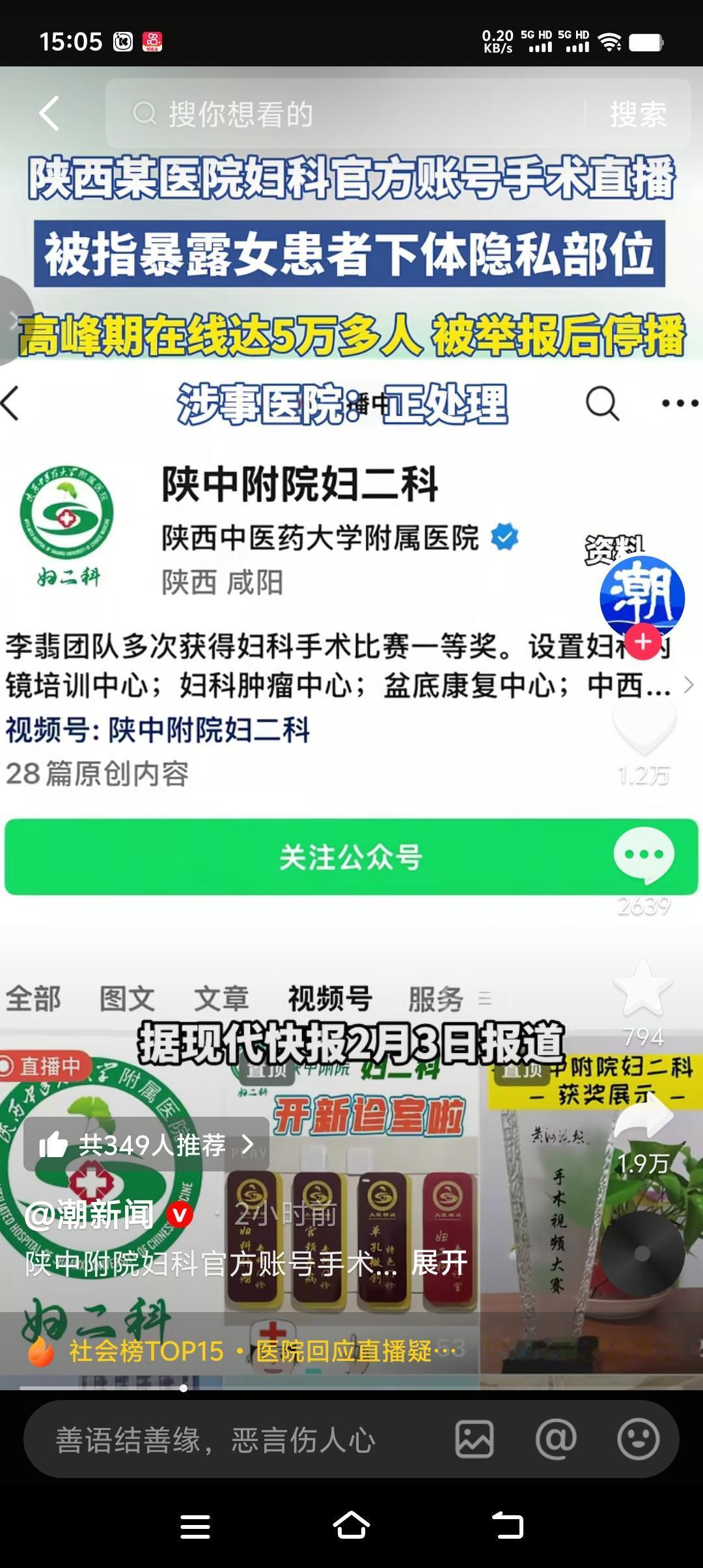 陕西某医院直播女患者做手术,直播间从开始的一千人直接飚到五万人,突然流量的暴增不是说医院有什么高科技,也不是说医生医术有多高明,而是女患者的下体隐私部位一览无遗的暴露在直播间,没有打任何马赛克。5万多人,10万多只眼睛那是看的清清楚楚,直播间顿时就炸锅了,甚至有的人在弹幕上开黄腔,直到多名网友集体举报后医院才中断直播。 开直播做手术,按理来说是一件好事情,一是为了给医院打广告,二是增加手术透明度,家属在直播间也能看到,三是敢于接受同行监督。但前提是要征的患者同意,需要隐私的部位必须打马赛克,否则就是对她人不尊重,再说的严重点儿就是侵犯她人隐私权。通过此事件,希望医院引以为戒,做手术本身就给患者造成了身体上的痛苦,切莫再给患者造成精神上的痛苦。