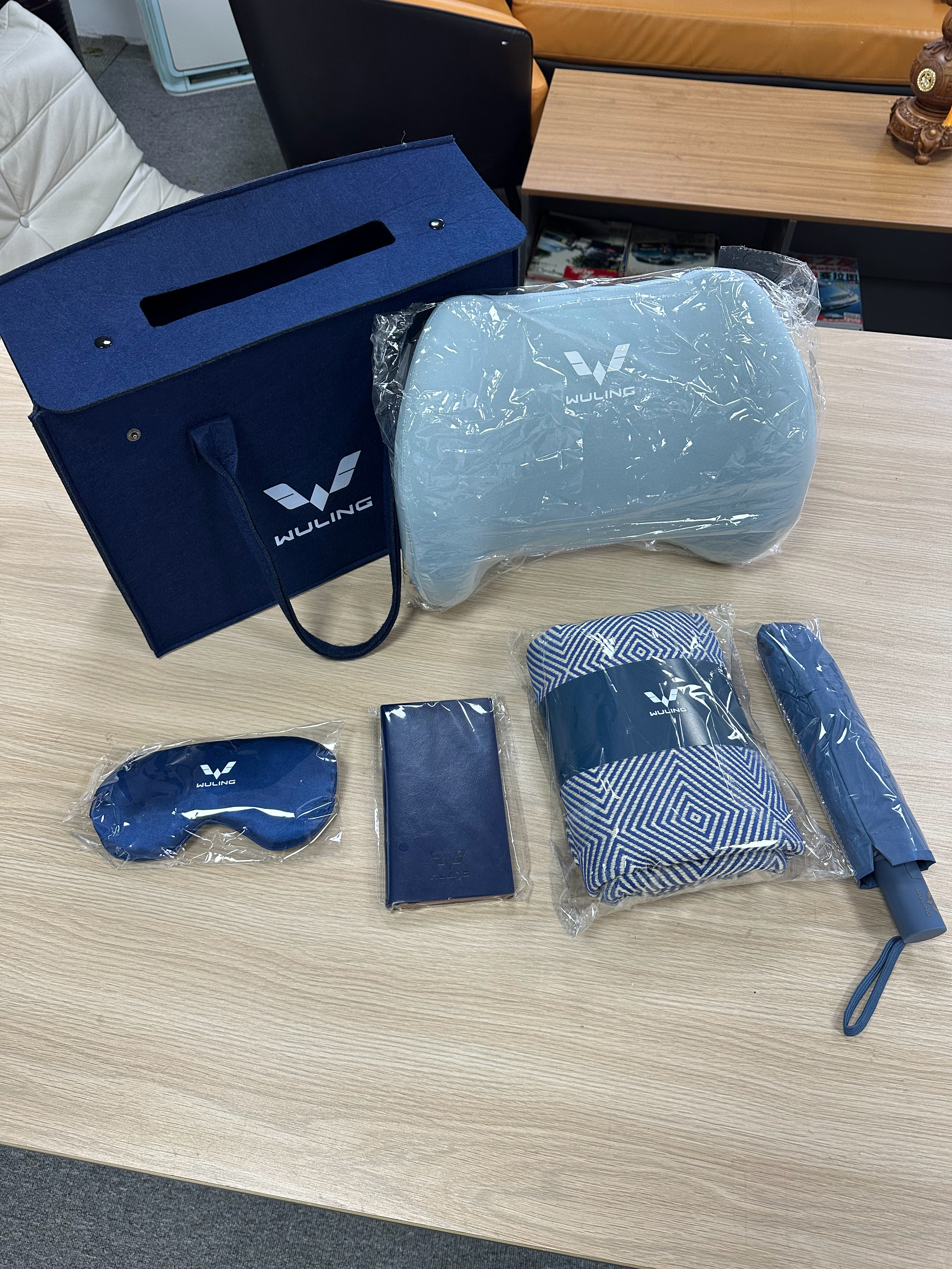 五菱送的大礼包,东西真不少眼罩、笔记本(不是电脑)、毛毯、雨伞、腰靠