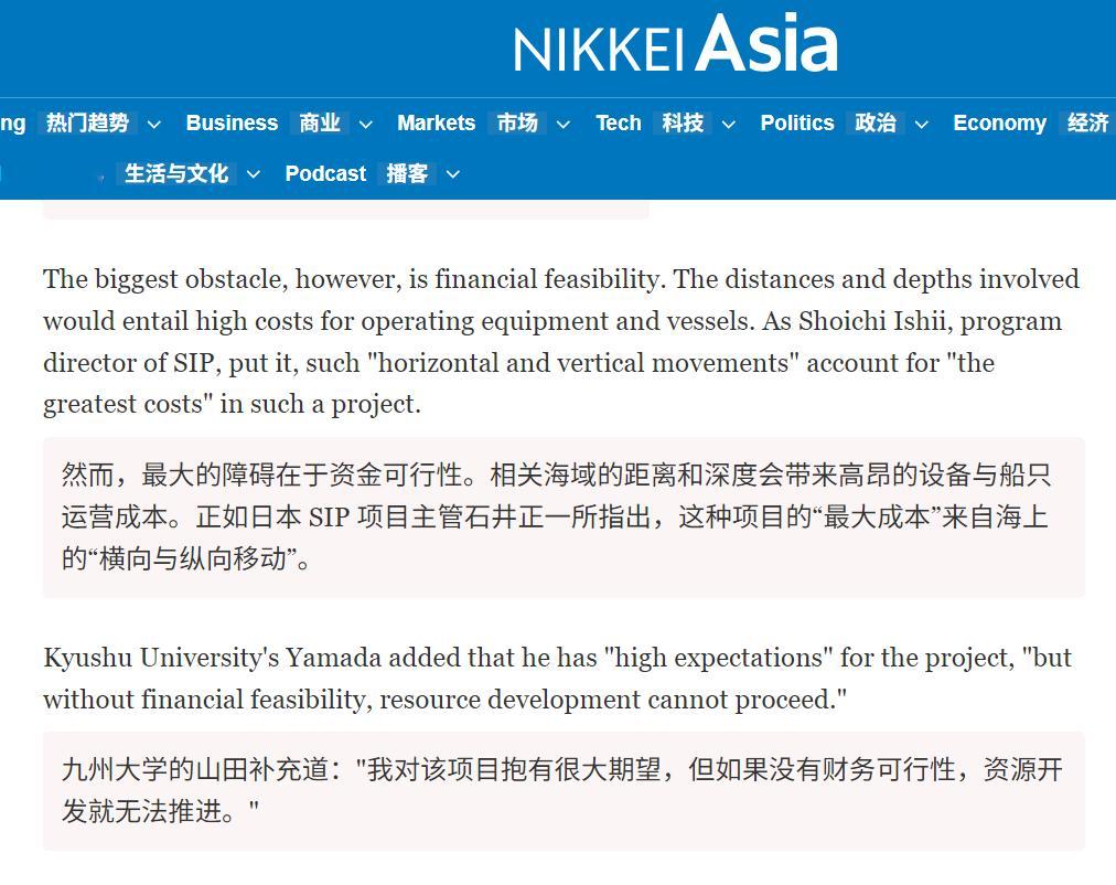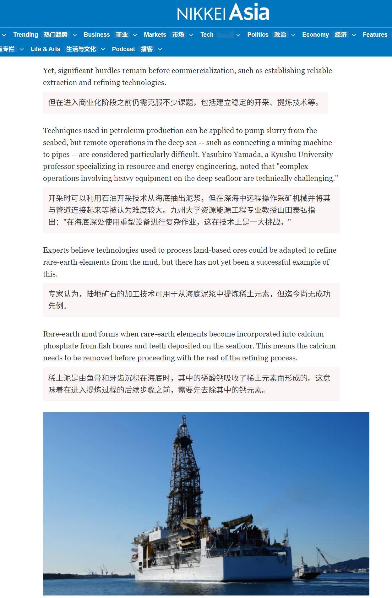🔻日经新闻:“九州大学资源能源工程专业教授山田泰弘指出:在海底深处使用重型设备进行复杂作业,这在技术上是一大挑战。陆地矿石的加工技术可用于从海底泥浆中提炼稀土元素,但迄今尚无成功先例。我对该项目抱有很大期望,但如果没有财务可行性,资源开发就无法推进。”中方回应日本挖到含稀土淤泥热点现场海外新鲜事