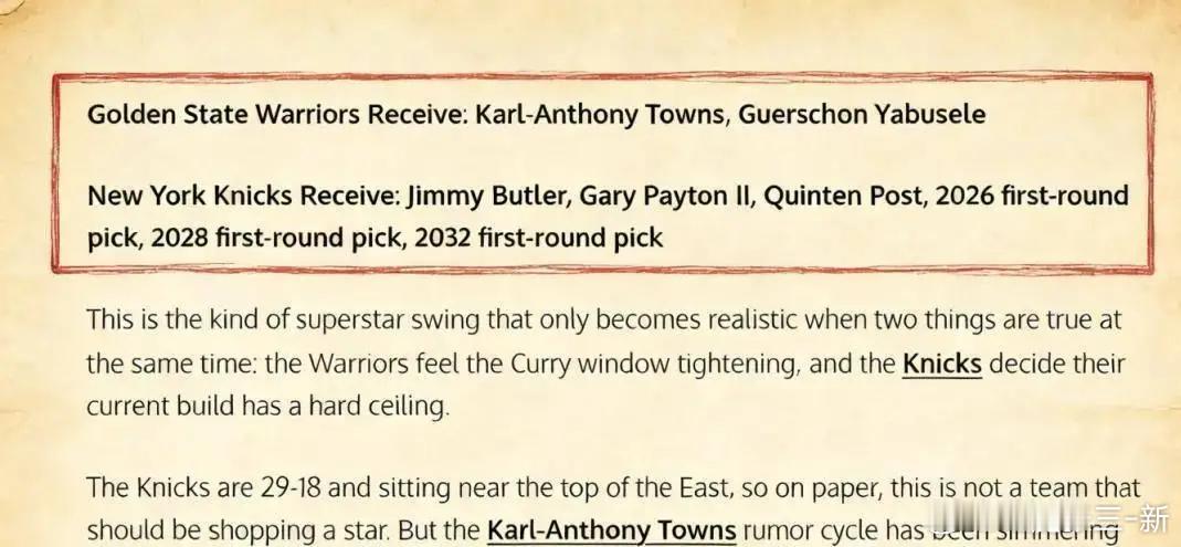 对字母哥感兴趣的球队一抓一大把,勇士在里面还真不算是筹码最硬的那一个。 万一,我说万一,这字母哥没追到手,勇士总不能干瞪眼吧? 你猜怎么着,美媒《Fadeaway World》就给支了一招:要是字母哥没戏,那就转头去追尼克斯的中锋唐斯! 他们甚至甩出了一套6换1的交易方案——勇士送出吉米·巴特勒、加里·佩顿二世、昆腾·波斯特,再加上2026年、2028年和2030年的首轮签,从尼克斯手里换来唐斯。