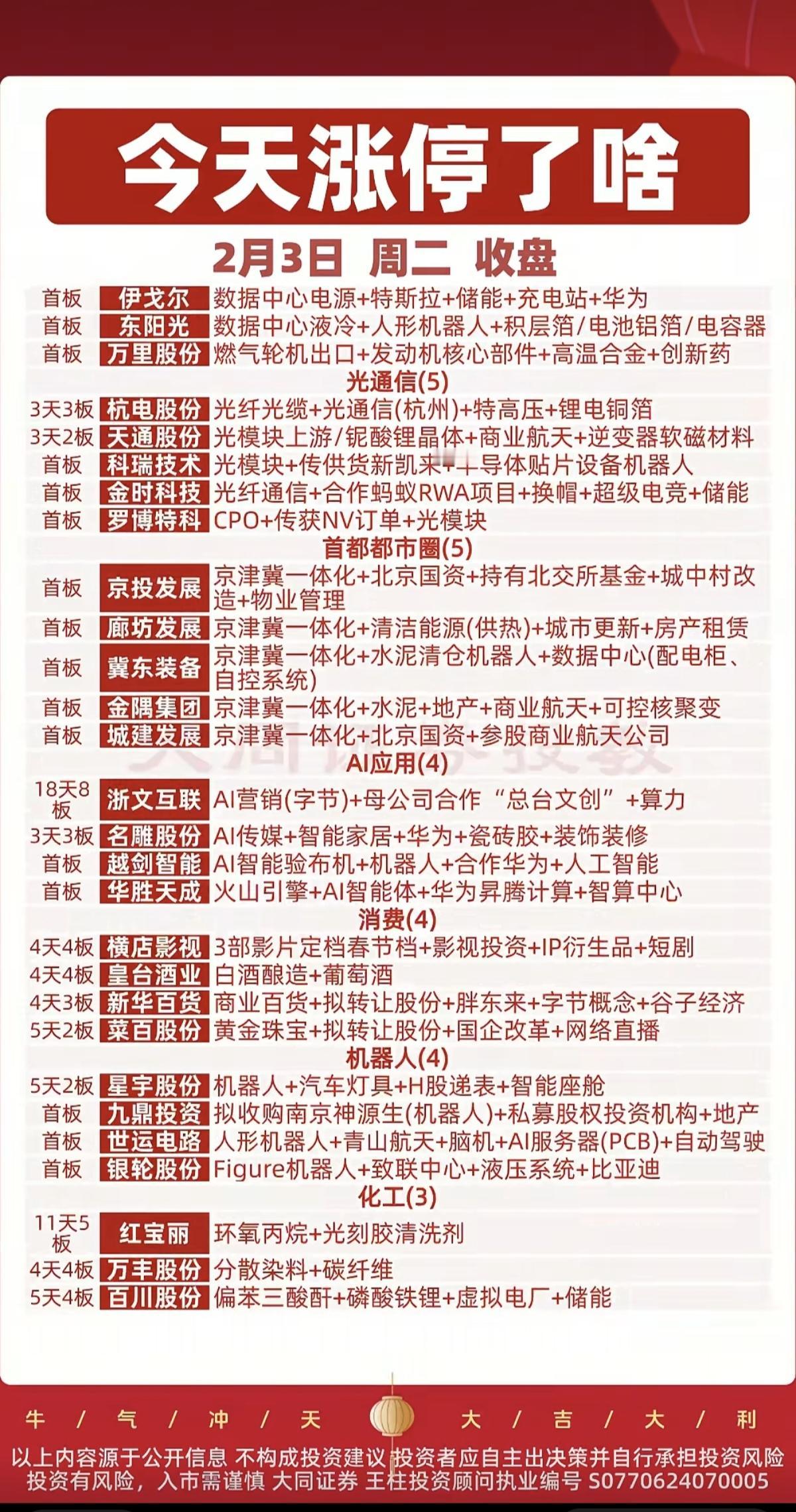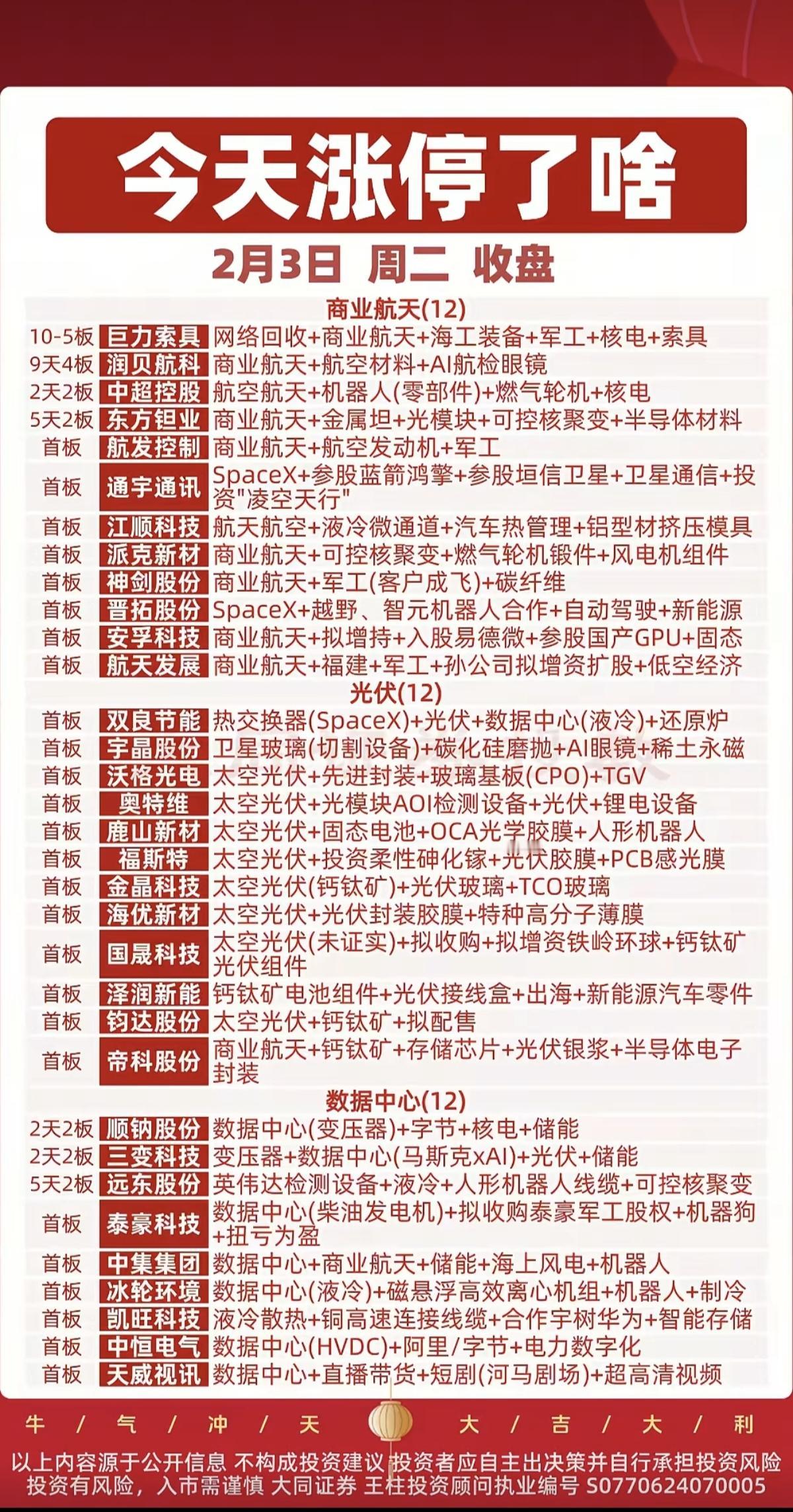 2.3周二 涨停板股票:题材+明细表! 商业航天 12股涨停 太空光伏 12股涨停 数据中心 12股涨停 光通信 5股涨停 京津冀地产 5股涨停 人工智能AI 4股涨停