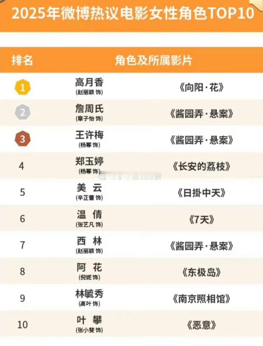 赵丽颖高月香热议电影女性角色TOP1 恭喜《向阳·花》,恭喜赵丽颖!她将这位底层女性高月香的坚韧演绎的深入人心,泥泞中向阳而生,一颦一动皆有故事感。这个角色能登顶TOP1,正是赵丽颖凭借扎实演所技赋予的光芒!