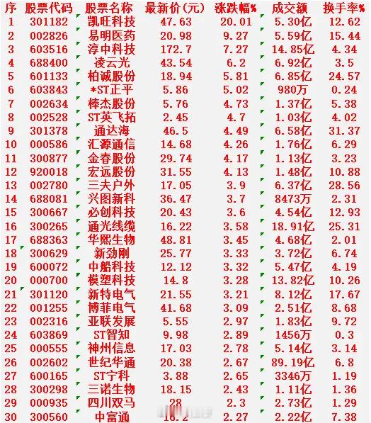 凯旺科技:最新价 47.63元,涨跌幅 +20.01%易明医药:最新价 20.98元,涨跌幅 +9.27%淳中科技:最新价 172.70元,涨跌幅 +7.27%凌云光:最新价 43.54元,涨跌幅 +6.20%柏诚股份:最新价 18.94元,涨跌幅 +5.81%ST正平:最新价 5.86元,涨跌幅 +5.02%棒杰股份:最新价 5.76元,涨跌幅 +4.73%ST英飞拓:最新价 2.45元,涨跌幅 +4.70%通达海:最新价 46.50元,涨跌幅 +4.49%汇源通信:最新价 14.68元,涨跌幅 +4.26%