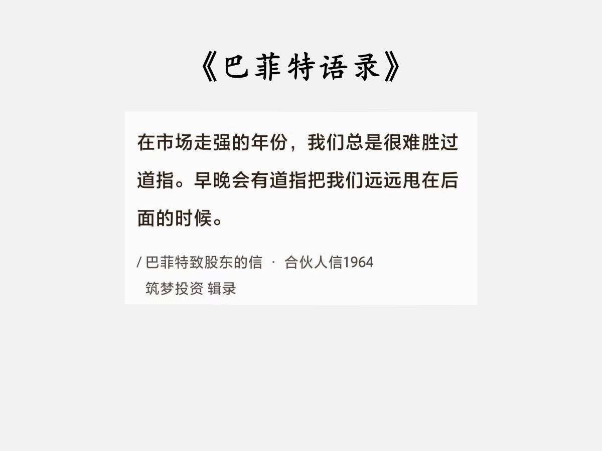 No.142 股神巴菲特谈“上涨的牛很难追” 巴菲特曰:“在市场走强的年份,我们总是很难胜过道指。早晚会有道指把我们远远甩在后面的时候。” 股市强劲上涨时,投资者反而很难跑赢主流指数。甚至在市场形势一片大好,牛市氛围浓厚时,亏损的投资者反而更多。换句话说,牛市是投资者亏损的主要原因。 关于这点,相信在过去的2025年,中国A股的投资者对此深有感触。 这一年,上证指数突破了4000点,创造了近十年的最高记录,录得了18%的涨幅。深证成指上涨了近30%,创业板指更是涨了近50%。相信很多投资者都没有跑赢它们。 好在一两年的投资业绩并没有什么实际意义。既不能说明投资者的能力强弱,也不能决定最终的成败得失。只要长期下来能跑赢,能做到股市长盈,一切就万事大吉。 如果一两年的短期业绩很优秀,但长期业绩却一塌糊涂,只赚得了短期的纸面富贵,而没有获得长期的真实利润,到头来两手空空,这非投资者所愿。 投资是一场长跑,不要用短跑的姿态去面对。要做就做股市寿星,而非争当股市明星。