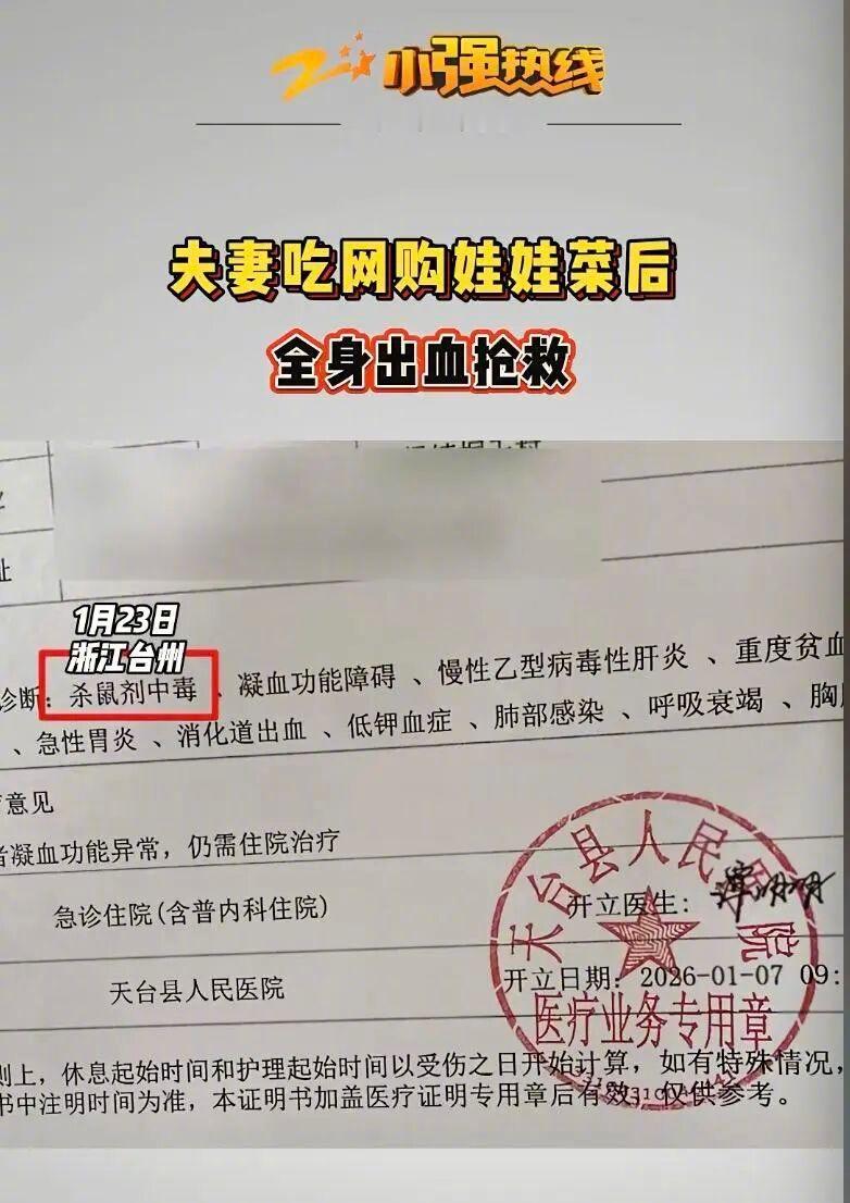 当地回应夫妻娃娃菜中毒疑丈夫下毒【“夫妻网购娃娃菜中毒系丈夫下毒”,当地回应:仍在调查中;村支书称夫妻系组合家庭、生有一女,男子平时很老实,两人关系很好】村支书回应夫妻娃娃菜中毒疑丈夫下毒2月3日,澎湃新闻报道称,从权威渠道获悉,“天台县夫妻吃网购娃娃菜中毒”一案,警方进一步侦查发现,下毒者系杨女士的丈夫,目前涉事男子已被警方采取刑事强制措施,案件还在进一步调查之中。红星新闻此前报道,台州天台县杨女士和丈夫于2025年12月网购娃娃菜,食用后夫妇俩同时出现全身出血症状,入院抢救。医院诊断结果显示,夫妇俩均为老鼠药中毒,杨女士和丈夫血液中均检测出杀鼠剂成分。随后警方也在网购娃娃菜中检测出老鼠药,并受案。1月26日,潇湘晨报报道,经警方调查,锁定了毒源为包裹娃娃菜的旧报纸在回收储存中沾染杀鼠剂,商家为压缩成本用其包装,导致有毒物质渗透污染蔬菜。涉事商家随后下架失联,平台已提供店主信息,警方正追查全链条责任。2月3日,红星新闻致电天台县委宣传部,工作人员表示,目前此案公安机关尚在进一步调查之中,媒体报道的情况“不确定是否属实”。随后,记者致电天台县公安局政工室,工作人员称,具体案情需要保密。▲杨女士和丈夫陈某波(左) 视频截图红星新闻此前了解到,杨女士的丈夫陈某波,为天台县石梁镇人。记者曾多次拨打陈某波电话,或无人接听,或被挂断。2月3日,记者再次拨打陈某波电话,系统提示“无法接通”。陈某波家所在村子的村支书告诉红星新闻,当时夫妻二人中毒后,被紧急送往浙江大学医学院附属第一医院的ICU抢救,脱离险情后,二人才从杭州转回天台县人民医院治疗。1月23日,浙江卫视1818黄金眼节目采访了杨女士,节目几乎全程以杨女士戴口罩讲述为主。节目中,陈某波对记者强调,“当时(娃娃菜快递)纸箱是完整的,粘着胶带,包装没有破损。打开后,娃娃菜被报纸包裹,没有套塑料袋。”于是才有了此后媒体报道的“毒源为包裹娃娃菜的旧报纸在回收储存中沾染杀鼠剂”的说法。据此前报道,杨女士告诉媒体,中毒后毒源一直成谜。而家中唯一的外来食品源,是事发前,她花了17.48元通过某电商平台一家商铺网购了一箱重约8斤的娃娃菜,12月16日到货。当天,夫妇俩清水煮了娃娃菜食用,次日两人同时出现身体不适。▲诊断证明经过医院抢救,杨女士夫妇病情逐渐稳定,转入普通病房治疗。天台县人民医院于2026年1月7日出具的诊断结果显示,杨女士为“杀鼠剂中毒、凝血功能障碍、慢性乙型病毒性肝炎、重度贫血”,此外还伴随“急性胃炎、消化道出血、低钾血症、肺部感染、呼吸衰竭”等症状。1月12日,夫妇俩选择报警。警方检测了杨女士家中物品,从娃娃菜中检测出了老鼠药。随后,天台县公安局受理了杨女士夫妇报称的涉事电商商家“生产、销售有毒、有害食品案”。陈某波家所在村子的村支书还对红星新闻介绍,陈某波、杨女士为二婚组合家庭,杨女士是贵州人,“她(杨女士)从贵州嫁过来的,来的时候带了一个儿子,现在已经上大学了;他们结婚都十几年了,后来夫妻俩又生了个女儿。女儿现在也上中学了。”村支书称,两人中毒后,女儿交给了邻居照顾。但2月3日看到“丈夫下毒”的新闻后,村支书感到“很震惊”,“他们夫妻平时关系很好的。我今天问了很多村民和邻居,都说他们平时没什么矛盾。陈某波也是很老实的一个人。”(红星新闻)