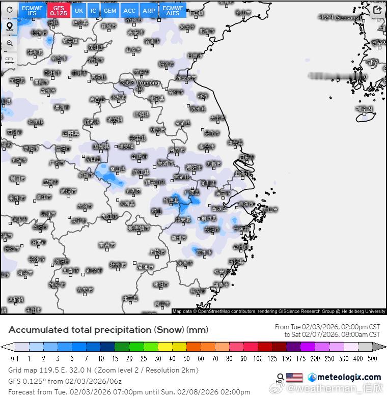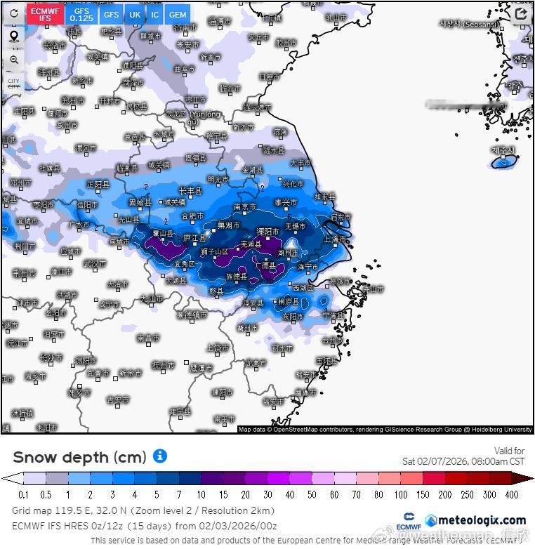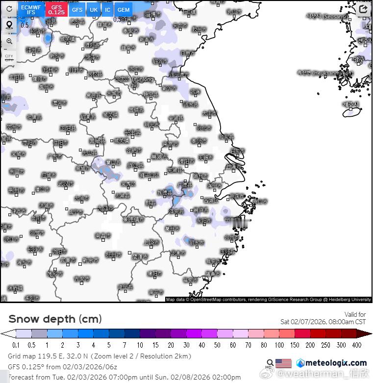 图3为欧洲数值预报到2月7日08时的累计降雪量,图4为美国数值预报的过程累计降雪量。图5-6为2月7日积雪预报的对比,图5为欧洲报,图6为美国报。总之,预报差异巨大,欧洲报目前的合理性存疑。降雪可能没有那么强。