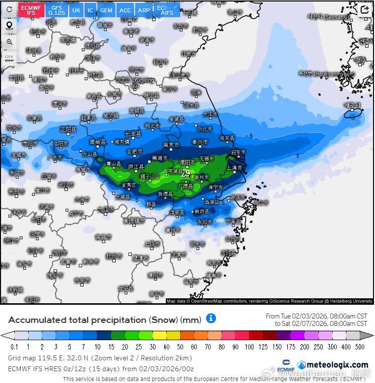 河南南部、江苏、安徽、上海、浙江北部、湖北北部等地将出现小雨转小到中雪或雨夹雪,苏皖南部、浙江北部等局地有大到暴雪;江淮至江南北部雨雪累计量有10~20毫米,苏皖南部至浙江北部局部有25~35毫米,平原地区新增积雪1~5厘米,山区积雪可达5~10厘米。