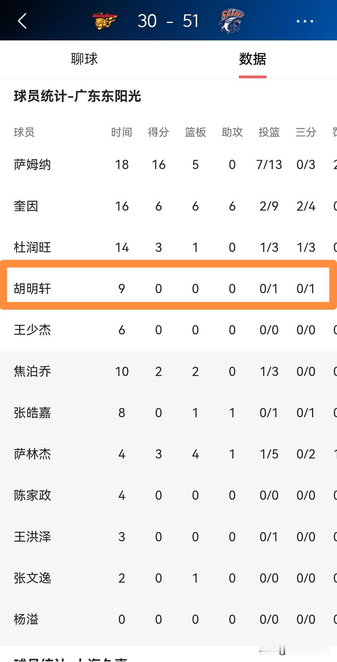 我对广东东阳光球星胡明轩彻底的无语了!在今天广东东阳光主场迎战上海久事的比赛中,目前双方半场战罢,广东东阳光以30:51落后对手多达21分。在前两节比赛中,胡明轩的表现完全就是一场灾难,他在进攻端毫无威慑力,他在首发出战的9分钟里,投篮1中0怒砍0分0篮板0助攻,不过有1次失误和2次犯规,他的场上正负值为-8。 对于胡明轩在上半场比赛中的低迷表现,我真是彻底的无语了,我真搞不懂他是怎么成为一名顶薪球员的。