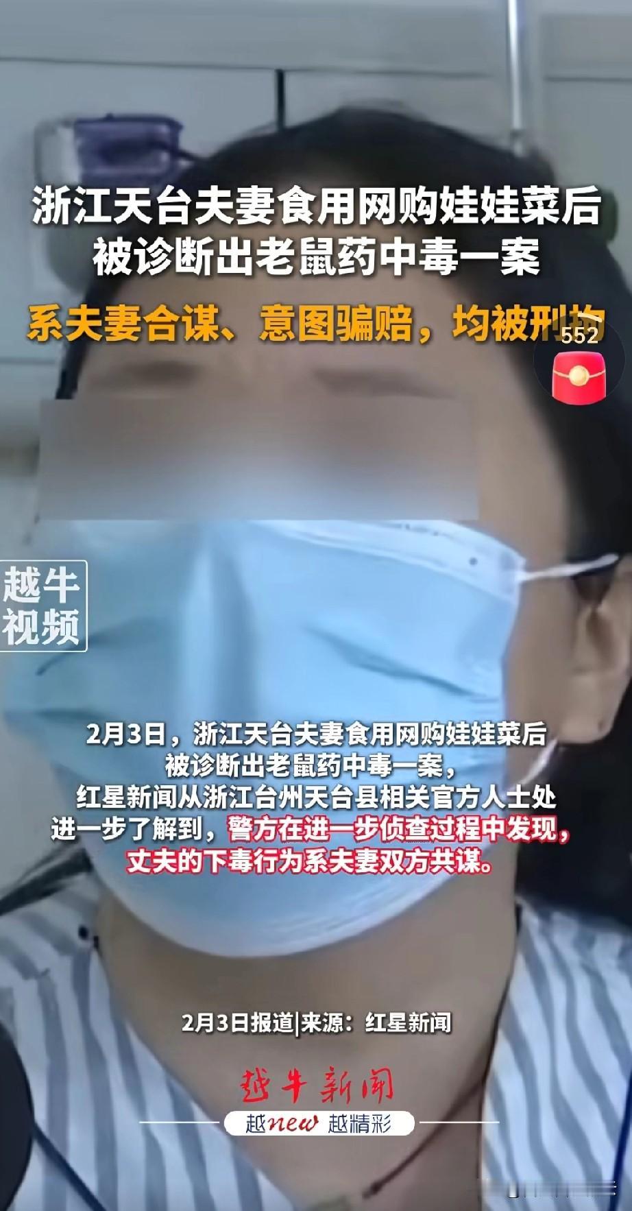 夫妻娃娃菜中毒事件又反转了,既不是商家包菜的报纸有问题,也不是丈夫下的毒,而是夫妻合谋制造中毒迹象,想向平台和商家索要巨额赔偿。 这个结局应该是最后的结果了,这夫妻俩已经被警方刑拘了。 这夫妻俩也真是个“人才”,耍的网友团团转。据当地村干部介绍,这对夫妻都是二婚,但是两人感情还挺好的。原来是两人志趣相投,也是没谁了。 还挺佩服他们的,为了要到赔偿,不惜以身试毒,你说万一量放多了,出什么意外,这也太得不偿失了。 对于这件事,你怎么看呢?