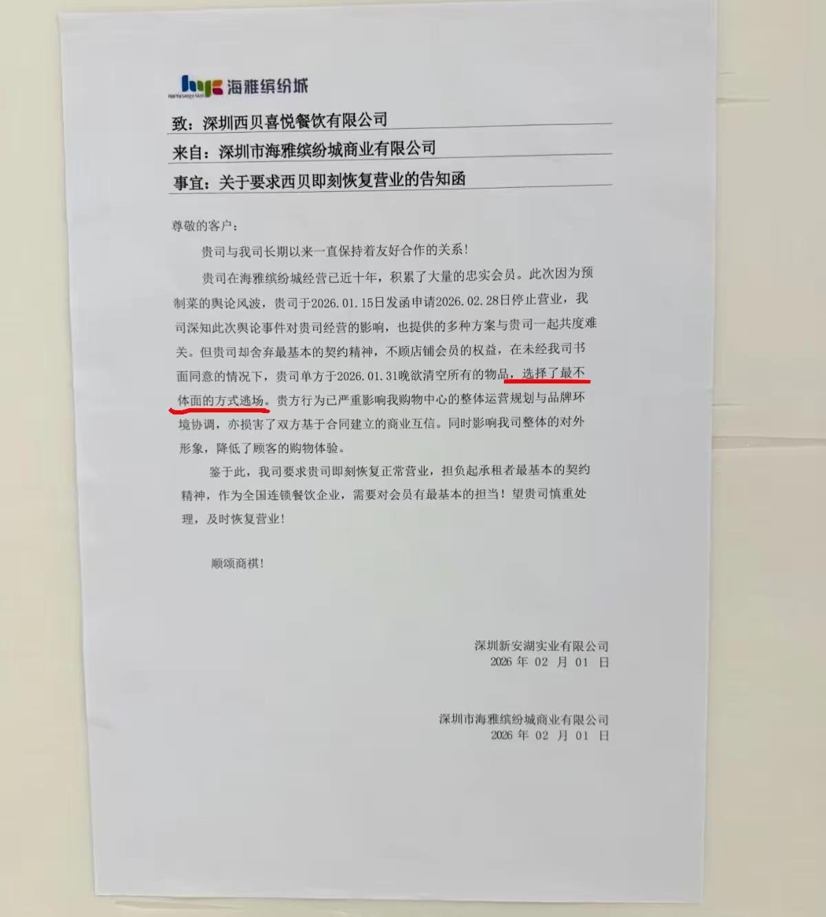 西贝贾国龙在深圳一个商场,用最不体面的方式逃场!全国跟西贝有合作的商场,这个时候应该是提心吊胆,如履薄冰,就怕西贝用深圳这种最不体面的方式半夜逃场关店! 我们以前在商场也开过实体店,如果实在经营不下去,一定会提前跟商场沟通,因为跟商场都是签了很严谨的合同,如果提前撤场的话,商场是可以起诉我们的!如果没有合理的沟通,不但押金退不回来,未来合同期内的租金还要补交,除非你耍赖,不怕法院黑名单! 像西贝这种餐饮店,有些客人是在里面有充值的,就好像有些健身会所一样,客人里面充了很多钱,如果你是半夜突然之间用这种最不体面的方式逃场,那么充值的客人就会来商场,找商场的麻烦,给商场制造很多负面影响! 西贝屁股一擦就自已走了,消费者往往会去找商场退,商场又没有收这个钱,那如果消费者又在媒体上发酵的话,那对这个商场是很大的负面情绪价值! 西贝还说号称中式餐饮品牌的头部企业,300多个分店,西贝用这种最不体面的方式逃场,那真的让人大掉眼镜,不像一个负责任的企业,无论如何对自己充值的客人要负责,最起码要提前几个月通知客人,让客人回来退钱,让客人满意的收到充值的款! 西贝这种退场模式还不如一个夫妻店坦荡,还说什么大连锁,想不明白,这样的一个企业可以发展这么大,相当令人意外! (图片来源网络。如有侵权,请联系删除)