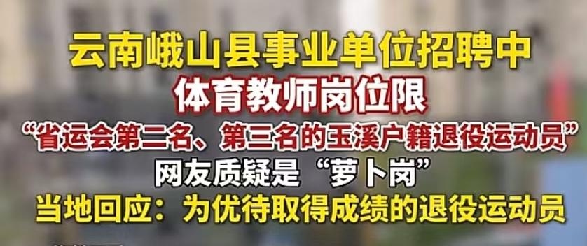 这种招聘真是第一次见,云南某学校招聘一个体育老师,招聘的条件是省运动会成绩第二第三名的退役运动员,看到只要第二和第三名,很多网友在评论区说就差报人家身份证了,还有的说,为什么不敢要前三名,是不是怕第一名也出来竞争啊,看到网友的质疑这是不是萝卜岗,学校只说这是优待退役运动员!看到这个回复,大家怎么看呢