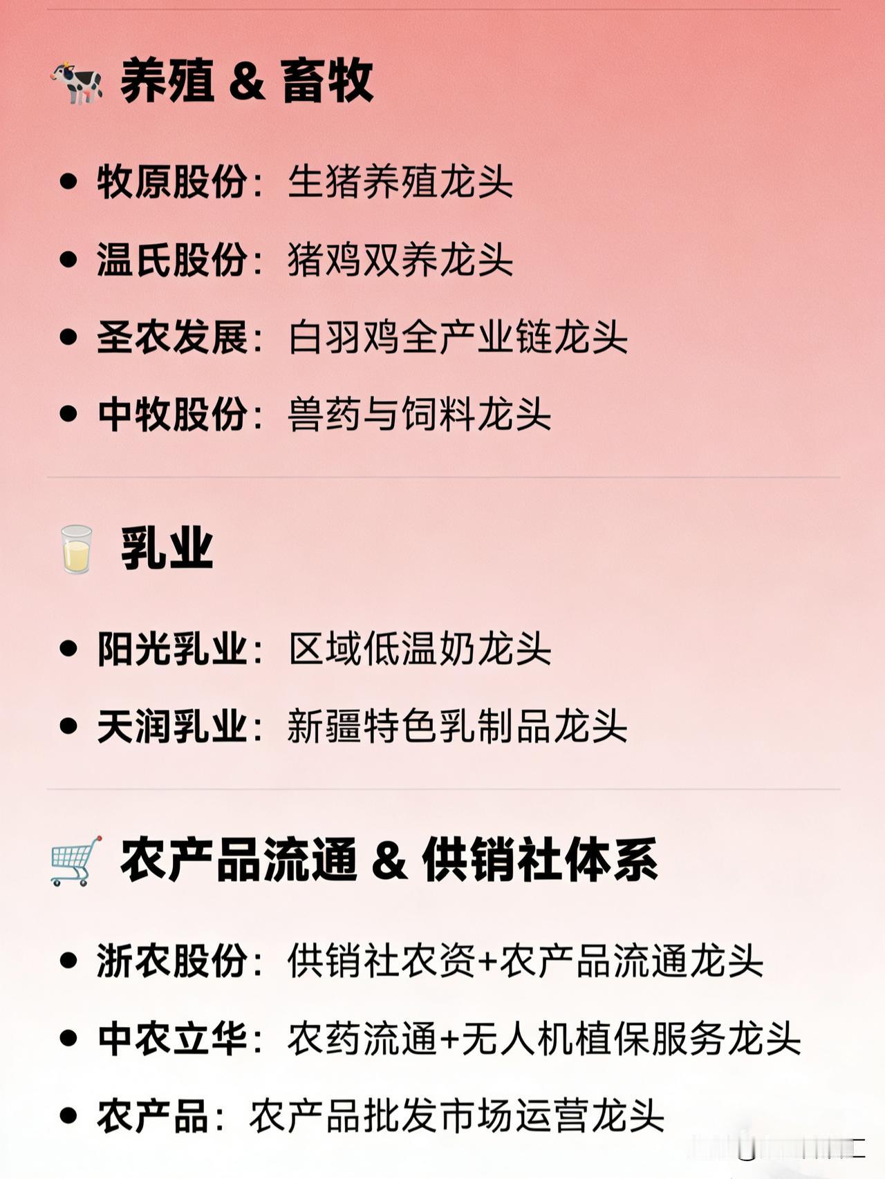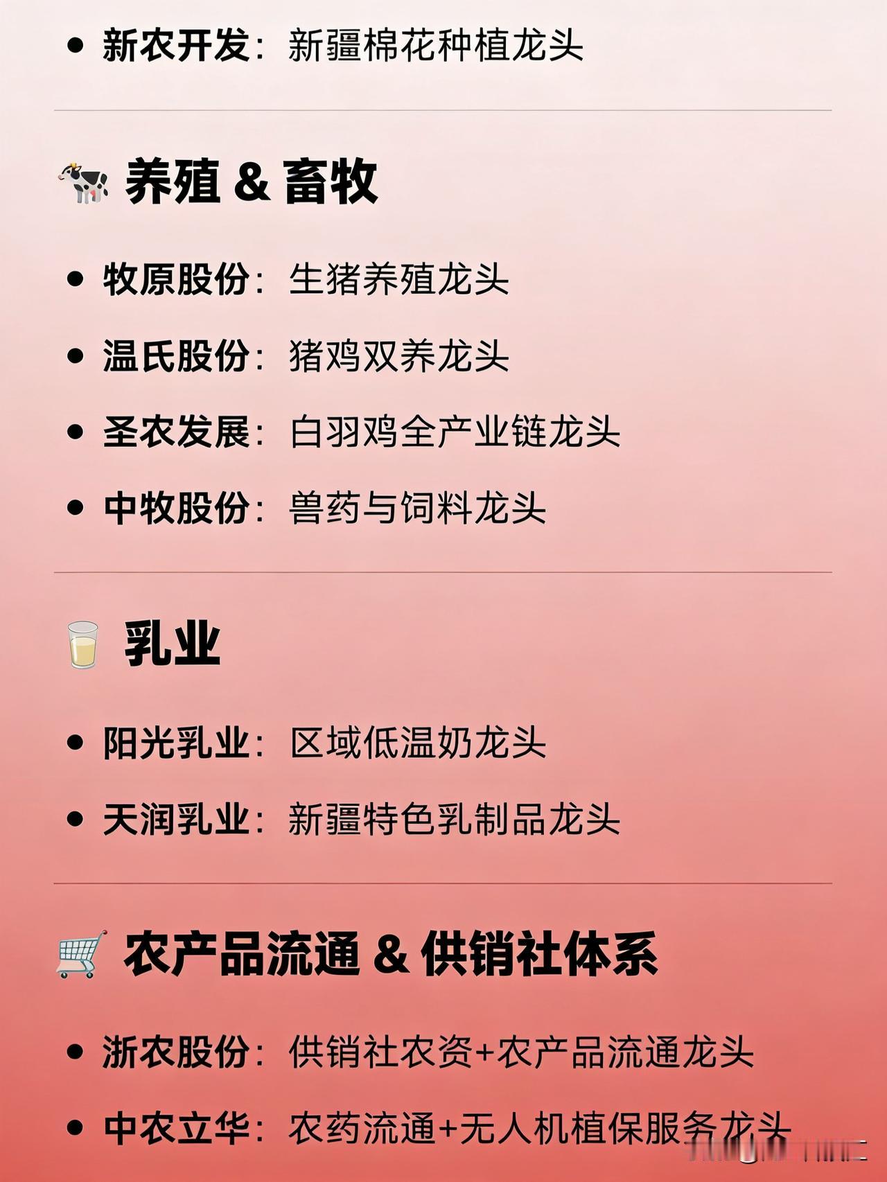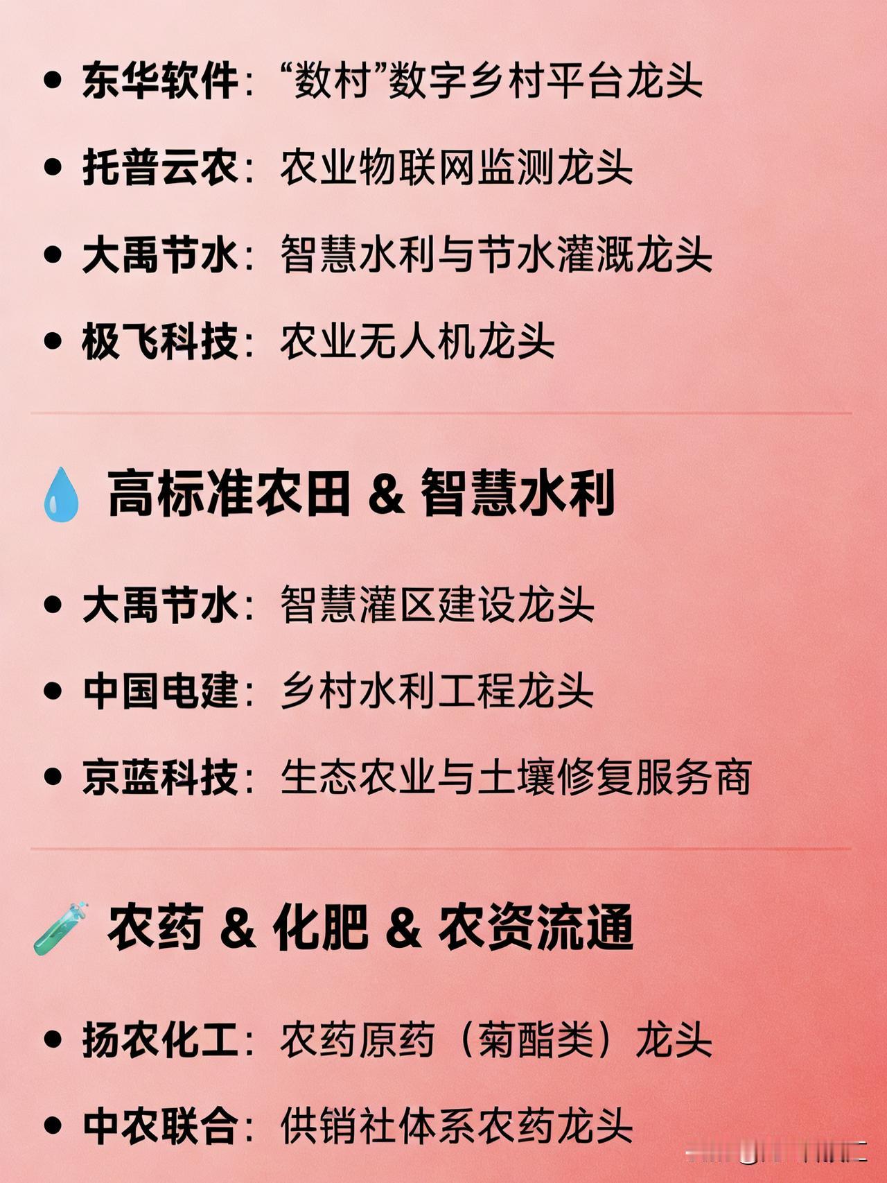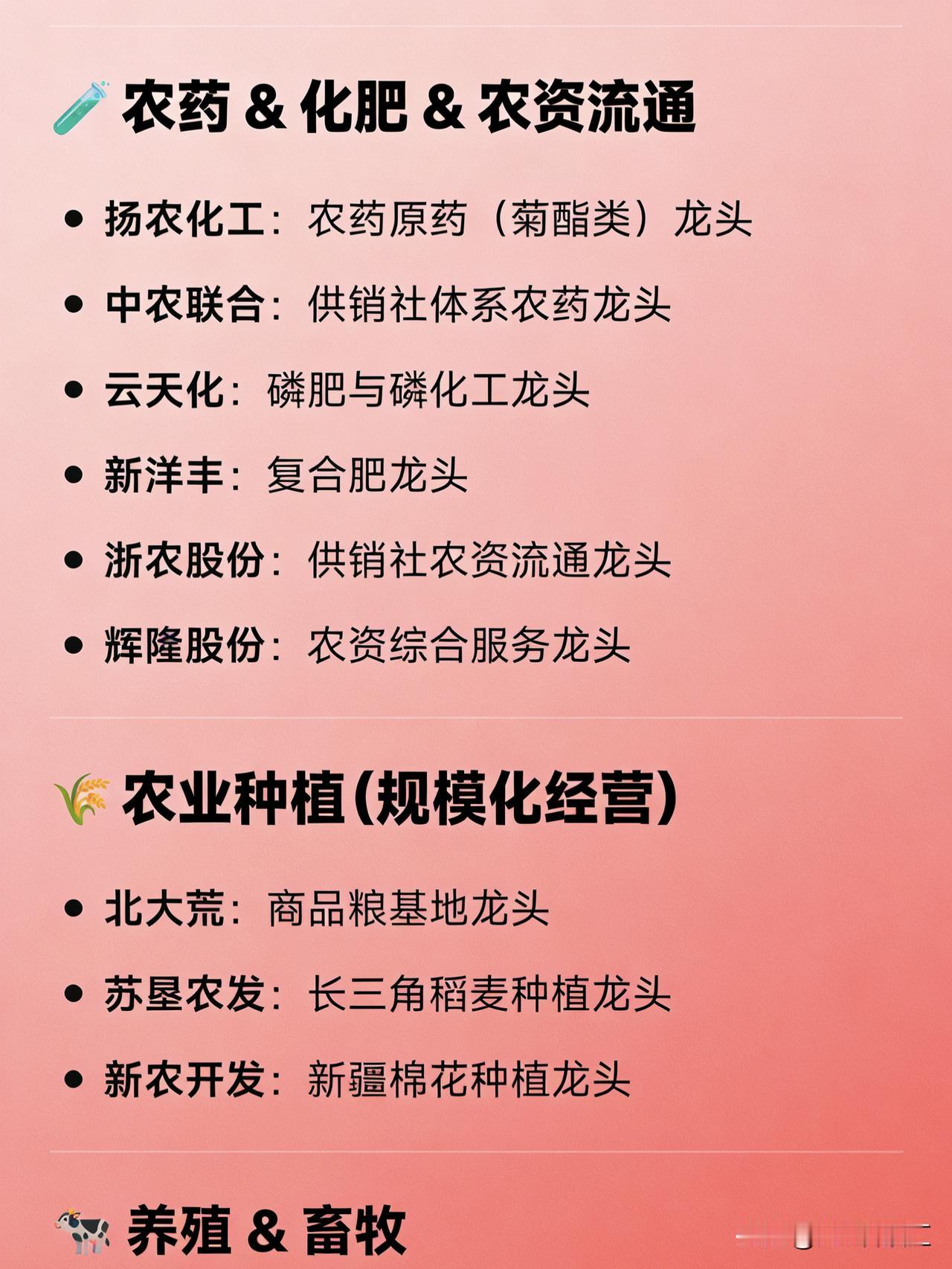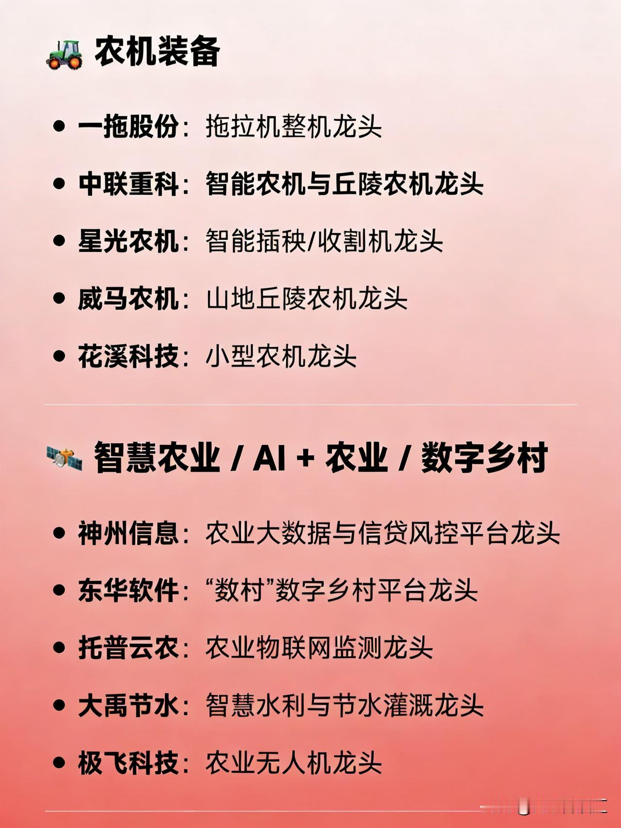 农业相关细分领域的龙头代表企业 🌾 种业 隆平高科:杂交水稻种子龙头 登海种业:玉米种子龙头 农发种业:央企背景粮食种子龙头 荃银高科:水稻育种与东南亚布局龙头 神农种业:高弹性种业先锋 秋乐种业:种业龙头 🚜 农机装备 一拖股份:拖拉机整机龙头 中联重科:智能农机与丘陵农机龙头 星光农机:智能插秧/收割机龙头 威马农机:山地丘陵农机龙头 花溪科技:小型农机龙头 🛰️ 智慧农业 / AI + 农业 / 数字乡村 神州信息:农业大数据与信贷风控平台龙头 东华软件:“数村”数字乡村平台龙头 托普云农:农业物联网监测龙头 大禹节水:智慧水利与节水灌溉龙头 极飞科技:农业无人机龙头 💧 高标准农田 & 智慧水利 大禹节水:智慧灌区建设龙头 中国电建:乡村水利工程龙头 京蓝科技:生态农业与土壤修复服务商 🧪 农药 & 化肥 & 农资流通 扬农化工:农药原药(菊酯类)龙头 中农联合:供销社体系农药龙头 云天化:磷肥与磷化工龙头 新洋丰:复合肥龙头 浙农股份:供销社农资流通龙头 辉隆股份:农资综合服务龙头 🌾 农业种植(规模化经营) 北大荒:商品粮基地龙头 苏垦农发:长三角稻麦种植龙头 新农开发:新疆棉花种植龙头 🐄 养殖 & 畜牧 牧原股份:生猪养殖龙头 温氏股份:猪鸡双养龙头 圣农发展:白羽鸡全产业链龙头 中牧股份:兽药与饲料龙头 🥛 乳业 阳光乳业:区域低温奶龙头 天润乳业:新疆特色乳制品龙头 🛒 农产品流通 & 供销社体系 浙农股份:供销社农资+农产品流通龙头 中农立华:农药流通+无人机植保服务龙头 农产品:农产品批发市场运营龙头 🤖 农业机器人 博实股份:果蔬采摘/分拣机器人龙头 润邦股份:智能养殖与加工机器人龙头