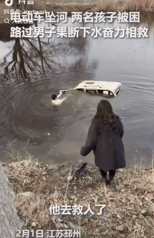 人民日报点赞!两个十几岁的孩子把电动三轮开到了河里。电动三轮车瞬间沉没,孩子被困水中。危急时刻,马女士的老公立即下水救人。 视频中一辆电动三轮车沉入水中,只露出车顶的部分,两个十几岁的孩子被困车中。马女士和老公正好看到,马女士的老公第一时间下水救人。幸好三轮车的位置离岸边不远,第一个孩子很快就被拉上了岸,但是孩子意识有点不清楚了,后来缓了一会儿好多了。 马女士老公转身又去救第二个孩子,第二个孩子的状态还不错。在其他好心人的帮助下,两个孩子被救了。两个孩子应该没有大碍,就是有些吓到了。 视频中一位黑衣女子,本来她可以不下水,在岸边等着就行。寒冷的冬天,她也毫不犹豫地下水帮助孩子。 现在正值寒假,孩子在家里无人监管,就很容易发生安全问题。虽然老师天天强调,但是大人们不上心,老师也没有办法。我们这的学校把安全问题放在首位,每次开家长会都会强调安全问题。即使现在放假了,老师每天也会在班级群里发安全提示。 安全问题不是小事,一旦发生,家长后悔也晚了。我们平时也要多提醒孩子安全方面的问题,让孩子有安全意识。