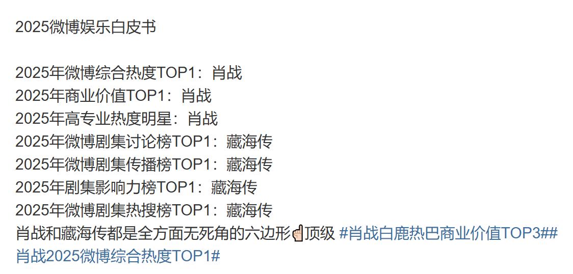 2025年收官了。 谁也想不到,肖战会取得如此骄人的成绩! 看过一个网友的总结,发现还真的是这样的。 网友发出的“2025微博娱乐白皮书”,肖战都是第一,简直不要太牛! 看看这些数据,可不是网友吹出来的,毕竟有图有真相啊—— 2025年微博综合热度TOP1:肖战 2025年商业价值TOP1:肖战 2025年高专业热度明星:肖战 2025年微博剧集讨论榜TOP1:藏海传 2025年微博剧集传播榜TOP1:藏海传 2025年剧集影响力榜TOP1:藏海传 2025年微博剧集热搜榜TOP1:藏海传 好吧,我承认,肖战赢了! 简直不要太夸张。 可是,这就是肖战!他的《藏海传》是真的演得很好!