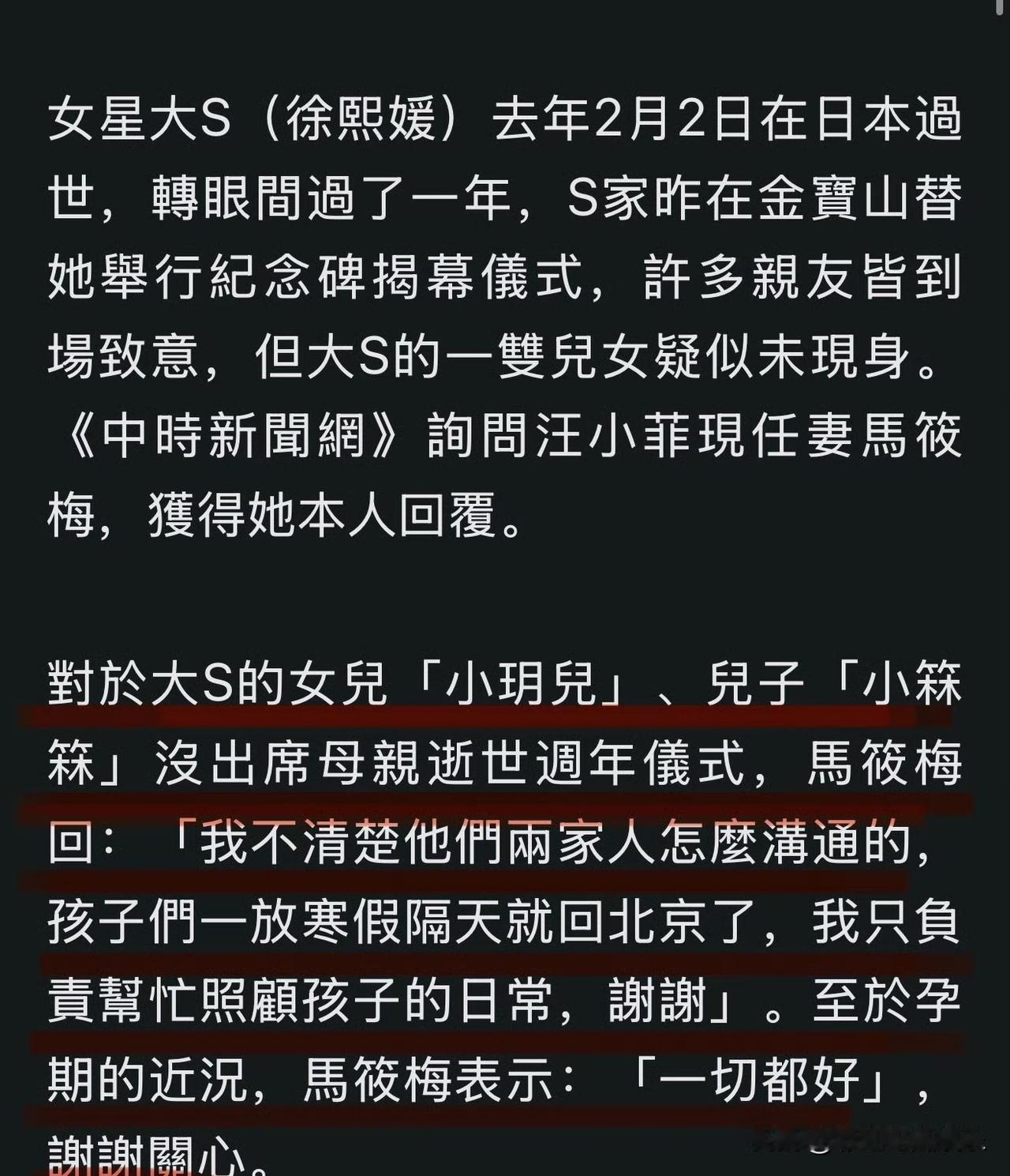 马筱梅回应为什么不让儿女去大S揭幕仪式,可能两家没有沟通好,孩子放寒假第二天就回北京了。 马筱梅很聪明,没有直接说孩子们没有被邀请,不想激化矛盾,毕竟具俊晔已经决定把遗产转给孩子们。 孩子们没有去,大S一定很伤心,天空下起了雨,他们在雨中揭开幕布,这些都是遗憾,徐家不认为,马筱梅也很无奈。如果事与愿违,上天一定另有安排。