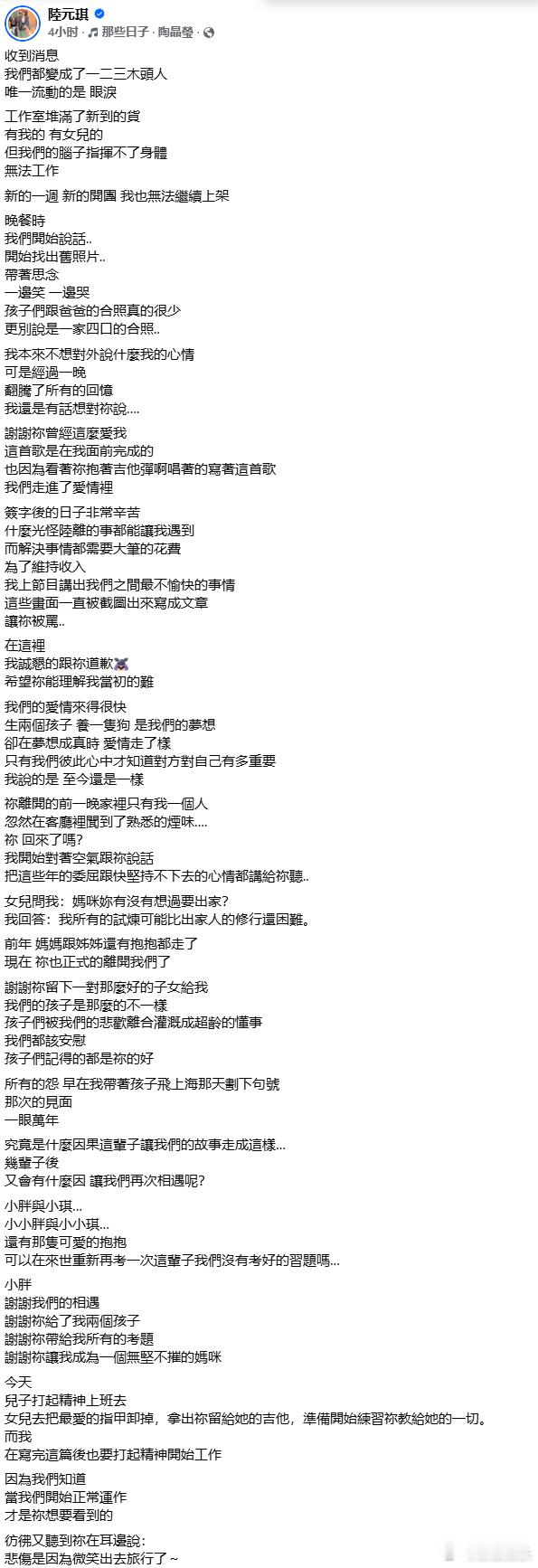 【前妻向袁惟仁道歉 】2月3日,袁惟仁前妻陆元琪发长文告白袁惟仁,并晒出一家四口合照。她坦白离婚后为了维持生计,曾在节目中谈及彼此最不愉快的过往,“这些画面一直被截图出来写成文章,让你被骂”,对此表示抱歉。她还表示自己和儿女已经打起精神正常生活,“谢谢我们的相遇,谢谢你给了我两个孩子,谢谢你带给我所有的考题,谢谢你让我成为一个无坚不摧的妈咪。”