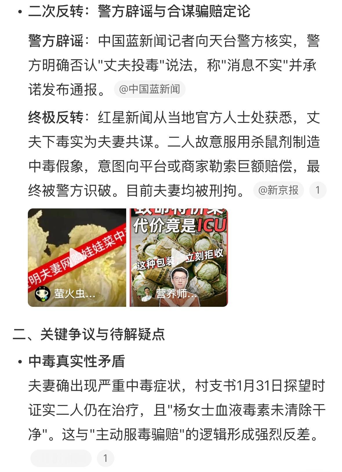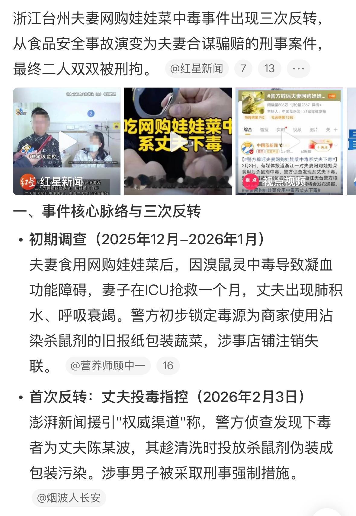 夫妻网购娃娃菜吃中毒系合谋下毒吃娃娃菜中毒夫妻均被刑拘怎么反转又反转的,先是说商家,后来变成丈夫下毒,现在合谋下毒骗保被刑拘?所以到底真相是什么…估计也只能等官方通报定性了才知道