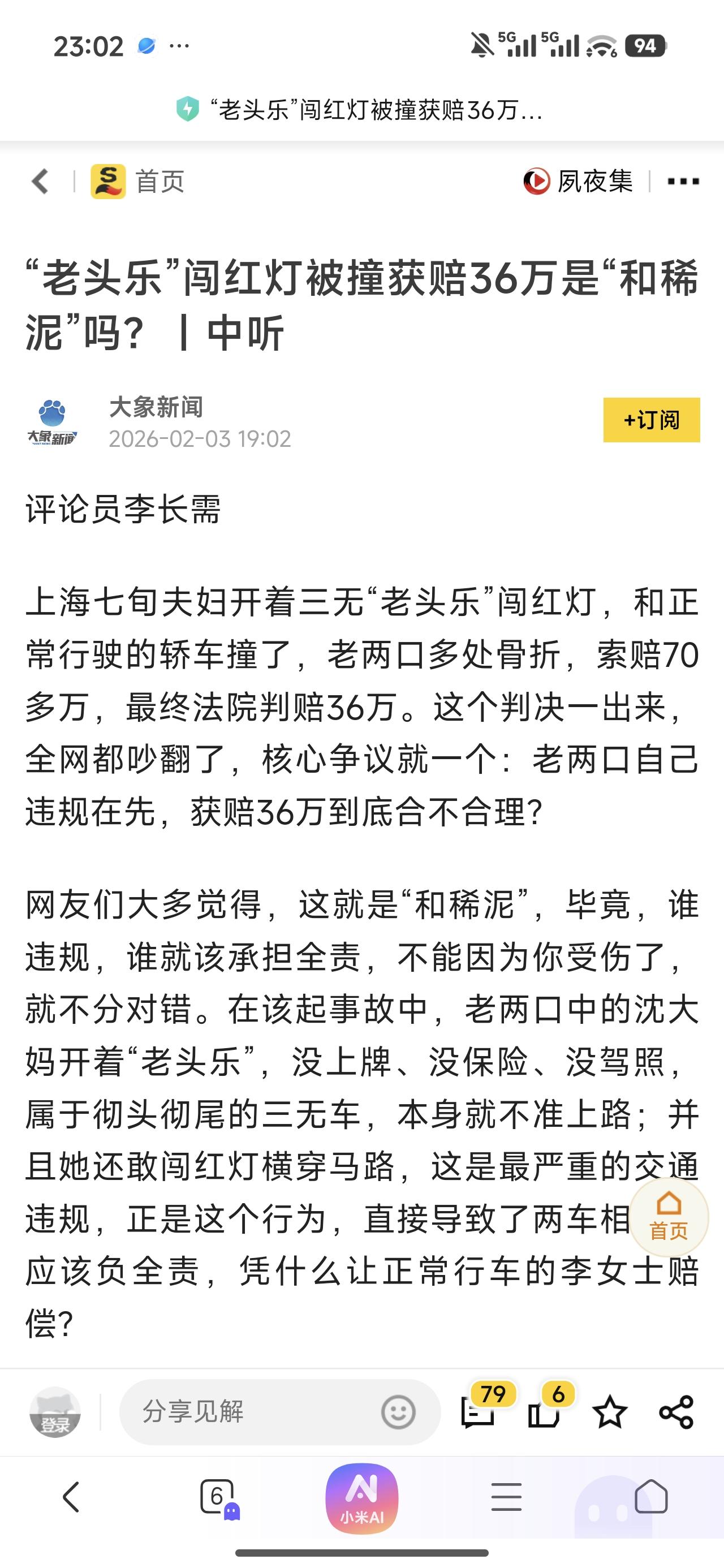 这个案例中有几个争议点: 一、老头乐又没有正式的名分,是按什么车辆来管理; 二、老头乐闯红灯在先,理应由老头乐方负主责,既然是老头乐方负主责,这个赔偿标准就明显偏高; 三、法院因为老人开的是老头乐,哪怕是违法违章,仍按弱势群体对待,对轿车驾驶方来说有失偏颇。