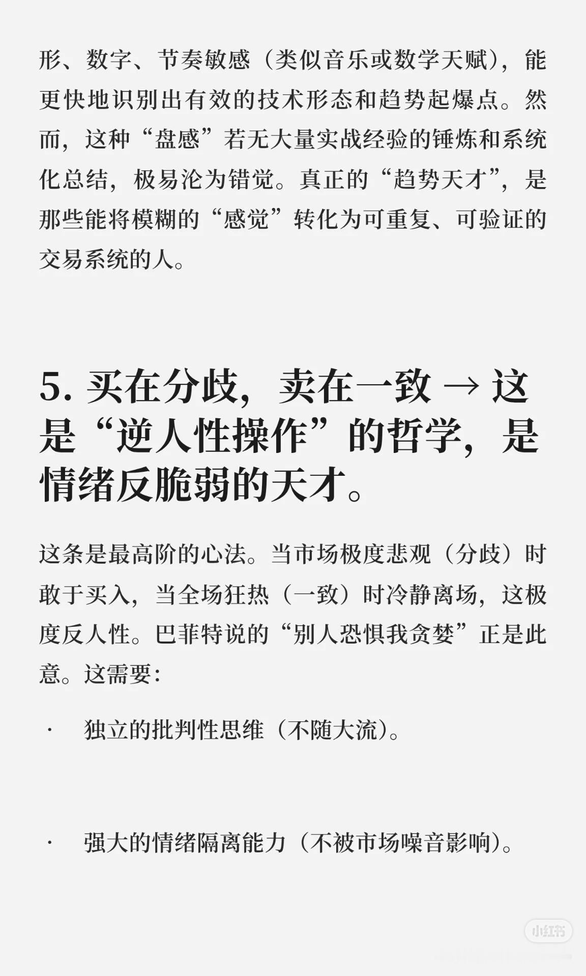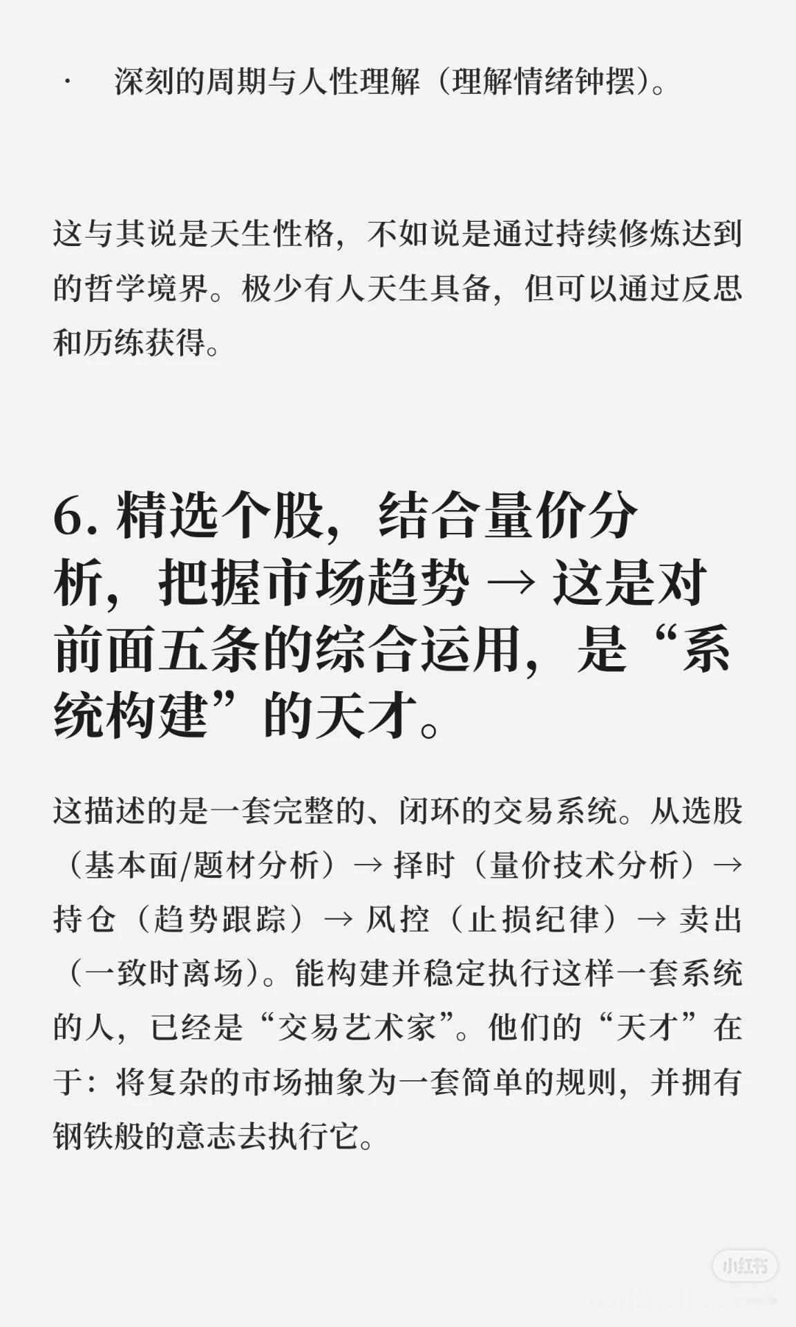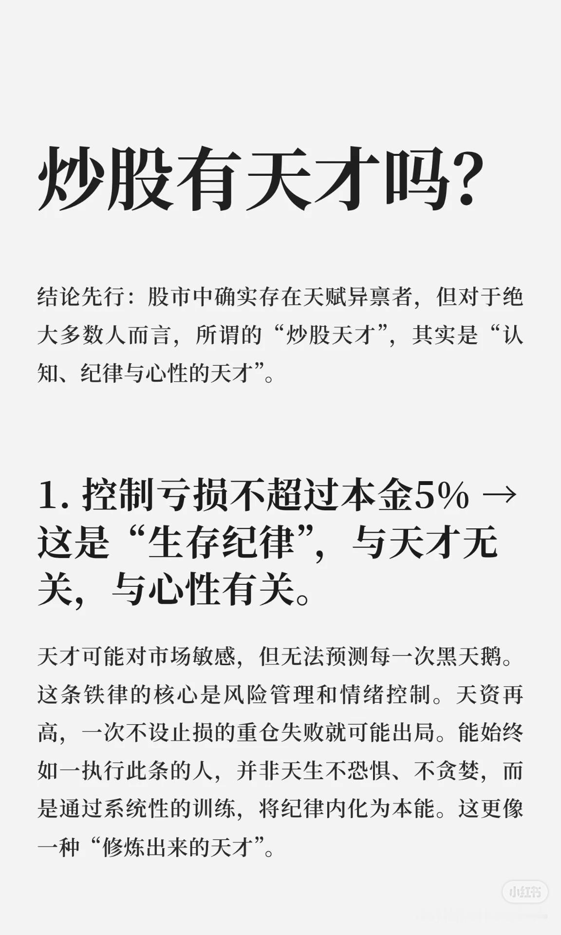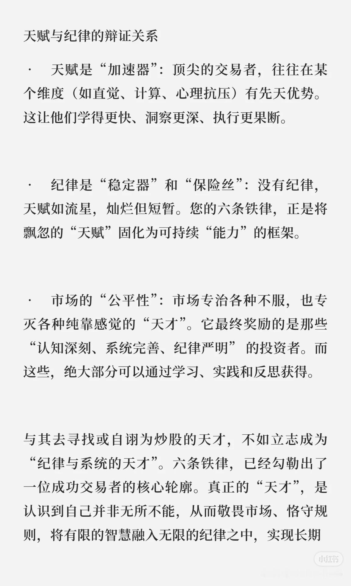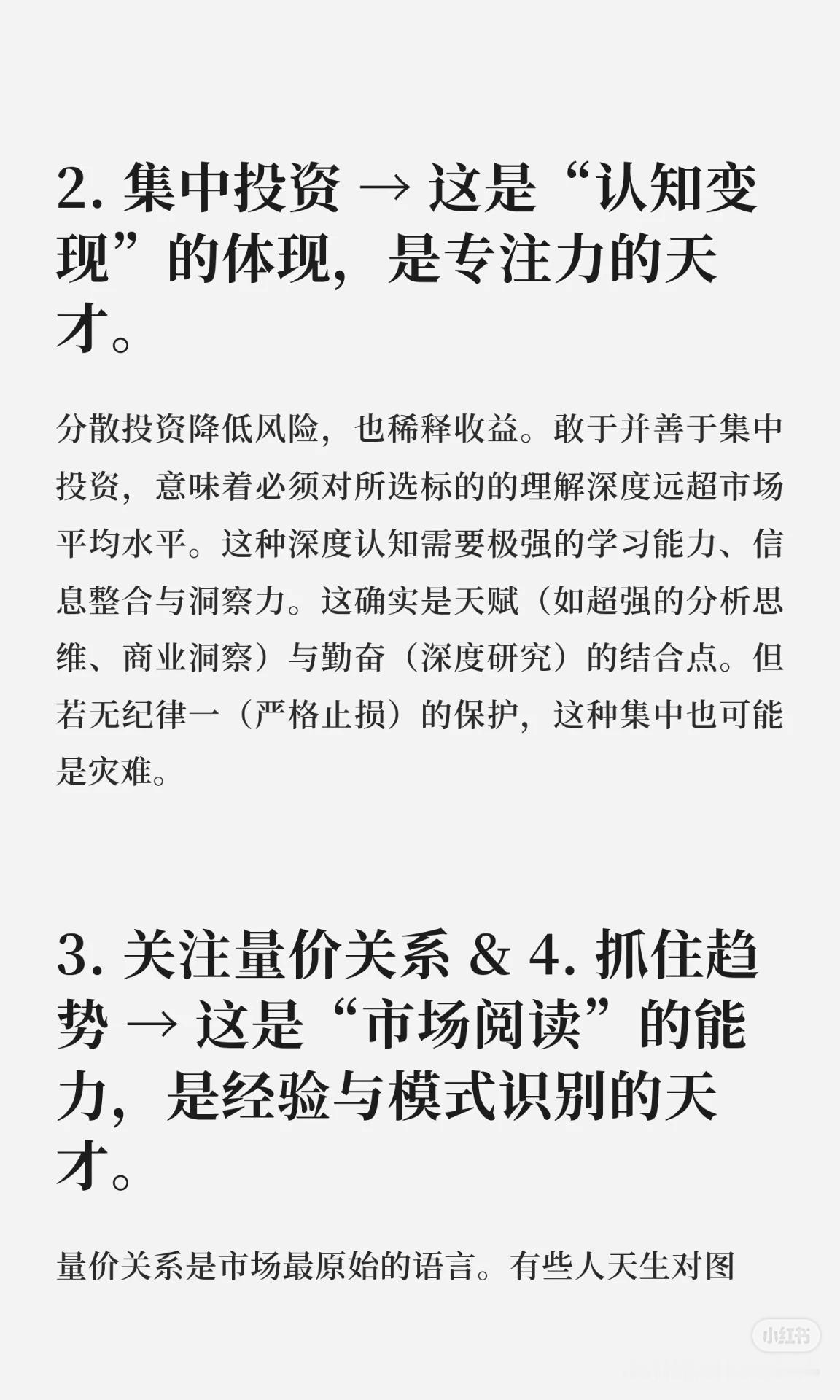 集中投资:是“认知变现”,需要对标的深度理解,结合专注力与学习洞察力;分散投资虽降风险,但会稀释收益。 量价关系 & 抓趋势:是“市场阅读”能力,依赖经验与模式识别,把盘感转化为可重复的交易系统。 买在分歧,卖在一致:是逆人性哲学,需要独立批判思维与情绪隔离,在市场悲观时买入、狂热时离场。 周期与人性理解:可通过修炼获得,不是纯粹天赋;综合运用选股、量价、趋势,形成闭环交易系统是“系统构建”的天才。 天赋与纪律关系:天赋是加速器,纪律是稳定器和保险丝;市场奖励认知深刻、系统完善、纪律严明的人,真正的高阶“天才”是稳健盈利并恪守规则。 一句话概括:投资中的“天才”不是天生的,而是通过深度认知、系统构建、逆人性操作和铁的纪律,实现长期稳健盈利的人。