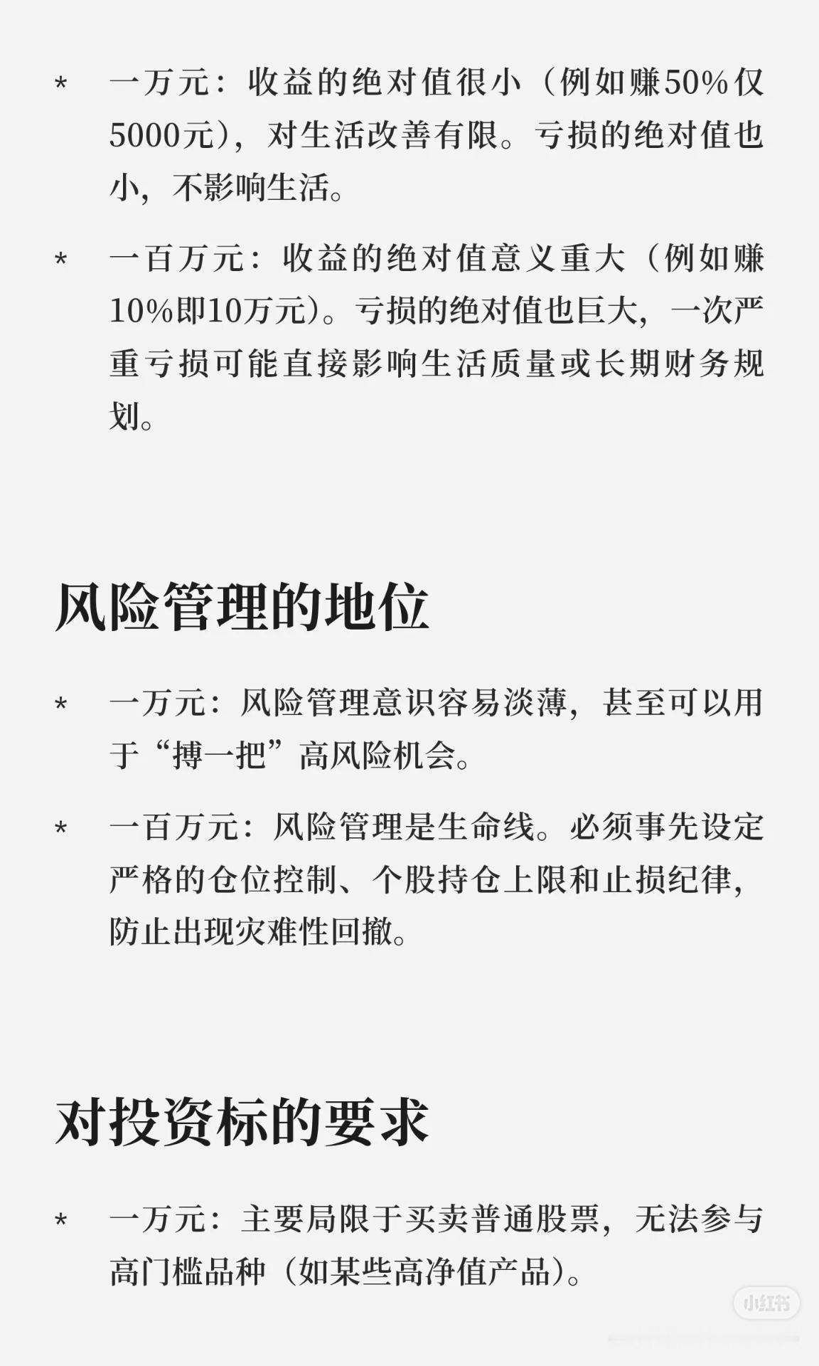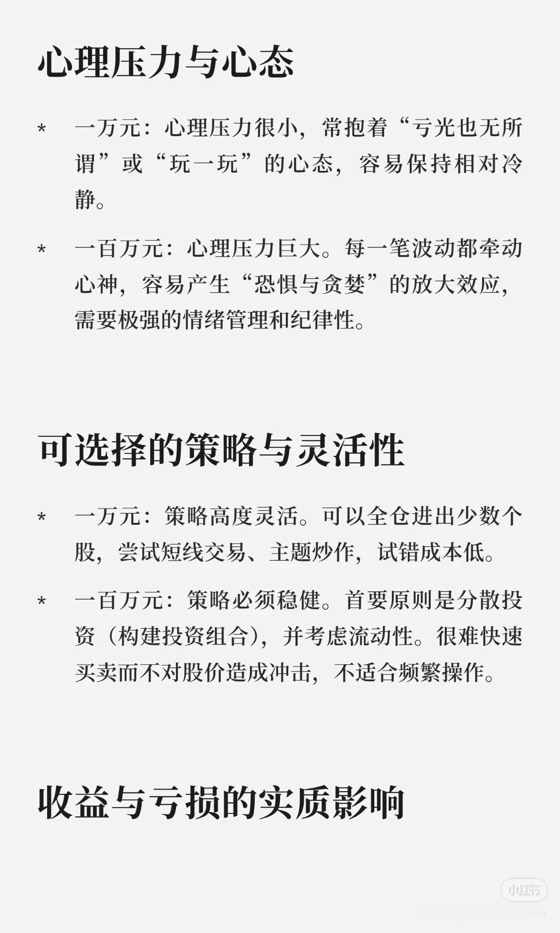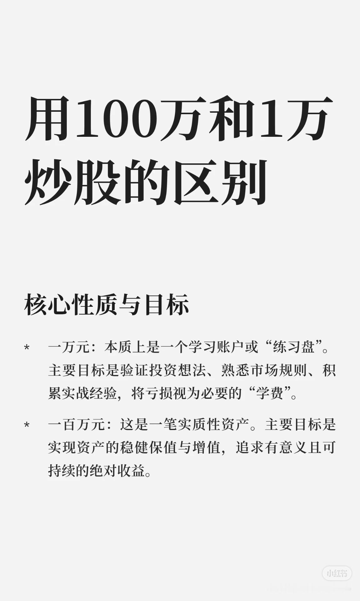 用100万和1万炒股的核心区别可概括为以下几点: 性质与目标:1万是学习账户(练习盘),目标是验证想法、积累经验,亏损当学费;100万是实质性资产,目标是稳健保值增值。 心态与压力:1万心理压力小(“玩一玩”心态);100万压力大,需强情绪管理和纪律性。 策略灵活性:1万策略灵活(全仓进出、短线试错);100万需稳健(分散投资、重流动性,难频繁操作)。 盈亏影响:1万盈亏绝对值小,对生活无显著影响;100万盈亏绝对值大,直接影响生活质量或财务规划。 风险管理:1万易淡薄(可搏高风险);100万是生命线(需严格仓位、止损纪律)。 投资标的:1万限于普通股票;100万可选范围广(指数基金、ETF、新股申购、对冲工具等)。 交易成本:1万成本绝对值低但占比不低;100万成本显著(频繁交易侵蚀利润,需考虑冲击成本)。 操作建议:1万重点在“学”(建交易系统、记交易、养习惯);100万重点在“配”(资产配置、控风险、借专业力量),是从“玩家”到“管理者”的身份转变。 核心原则:1万是“学费/门票”,用输不起的钱学规则;100万是“责任/战役”,需成熟体系和风险管控,大资金前先小资金“学飞”更理智。