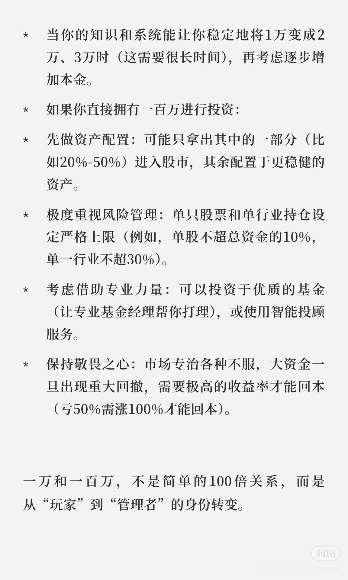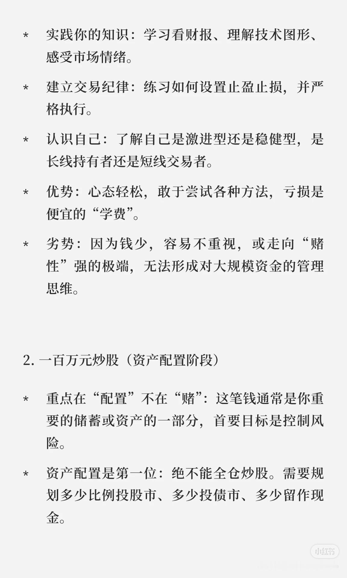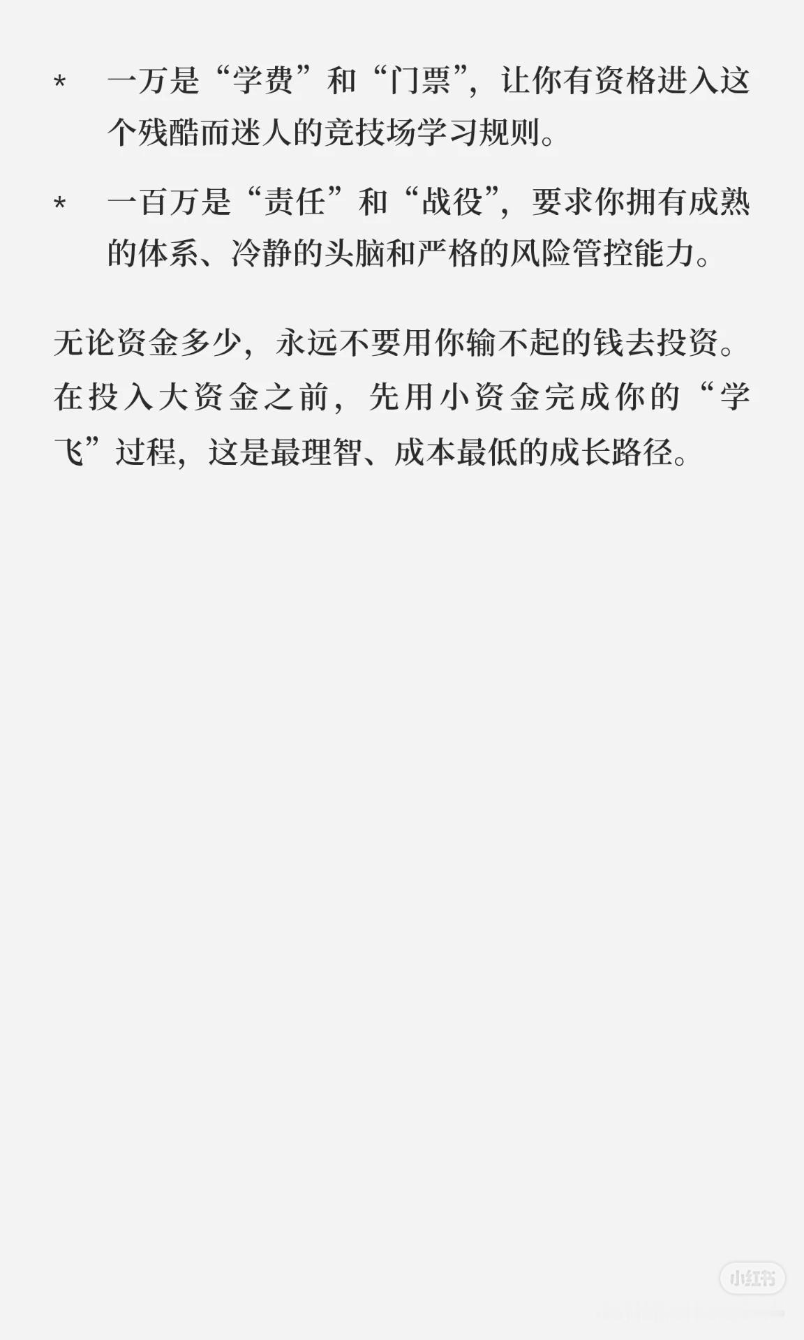 用100万和1万炒股的核心区别可概括为以下几点: 性质与目标:1万是学习账户(练习盘),目标是验证想法、积累经验,亏损当学费;100万是实质性资产,目标是稳健保值增值。 心态与压力:1万心理压力小(“玩一玩”心态);100万压力大,需强情绪管理和纪律性。 策略灵活性:1万策略灵活(全仓进出、短线试错);100万需稳健(分散投资、重流动性,难频繁操作)。 盈亏影响:1万盈亏绝对值小,对生活无显著影响;100万盈亏绝对值大,直接影响生活质量或财务规划。 风险管理:1万易淡薄(可搏高风险);100万是生命线(需严格仓位、止损纪律)。 投资标的:1万限于普通股票;100万可选范围广(指数基金、ETF、新股申购、对冲工具等)。 交易成本:1万成本绝对值低但占比不低;100万成本显著(频繁交易侵蚀利润,需考虑冲击成本)。 操作建议:1万重点在“学”(建交易系统、记交易、养习惯);100万重点在“配”(资产配置、控风险、借专业力量),是从“玩家”到“管理者”的身份转变。 核心原则:1万是“学费/门票”,用输不起的钱学规则;100万是“责任/战役”,需成熟体系和风险管控,大资金前先小资金“学飞”更理智。