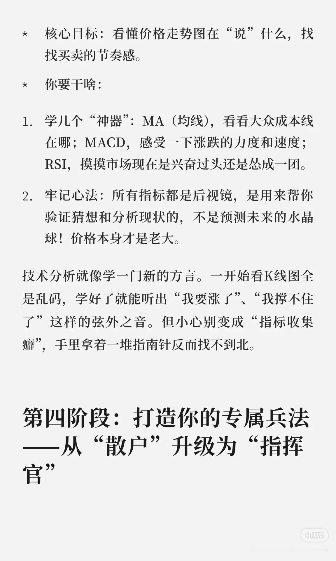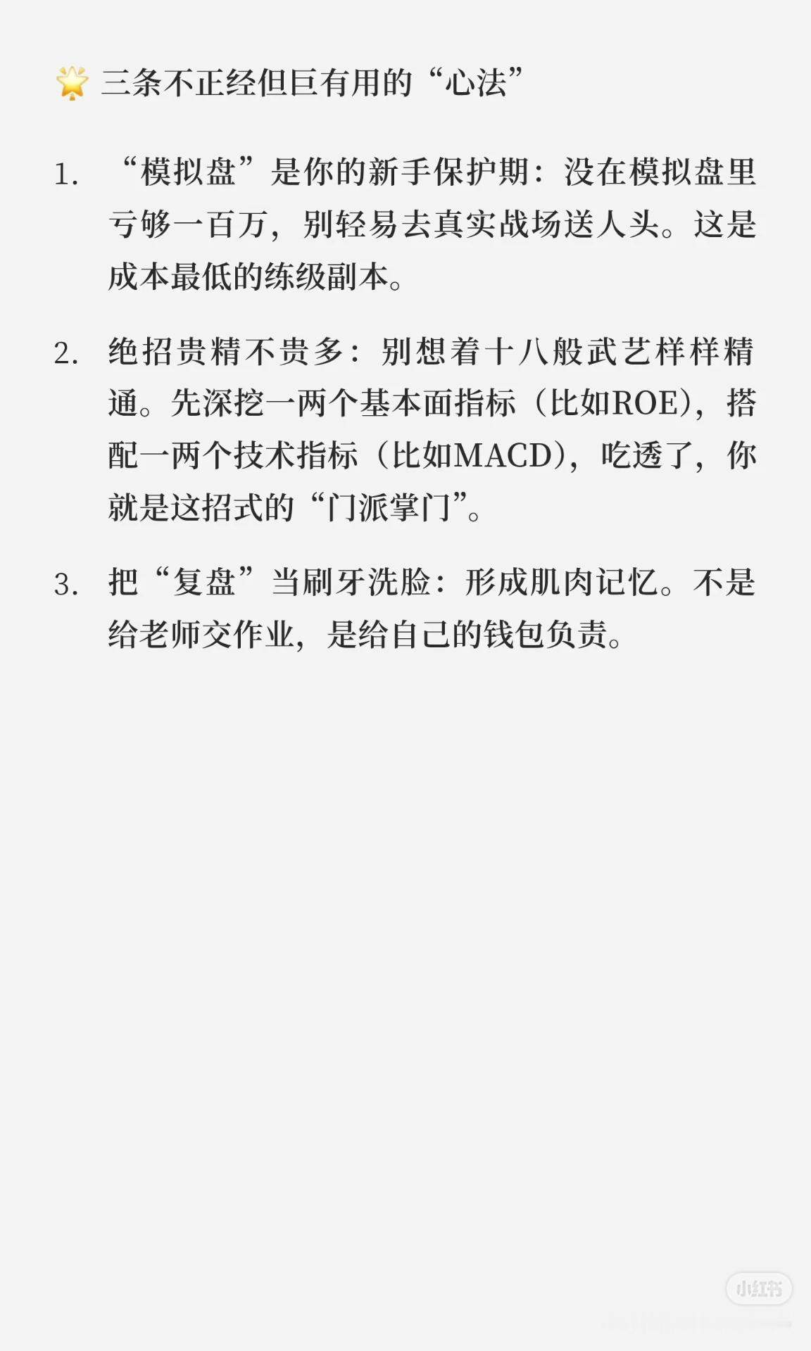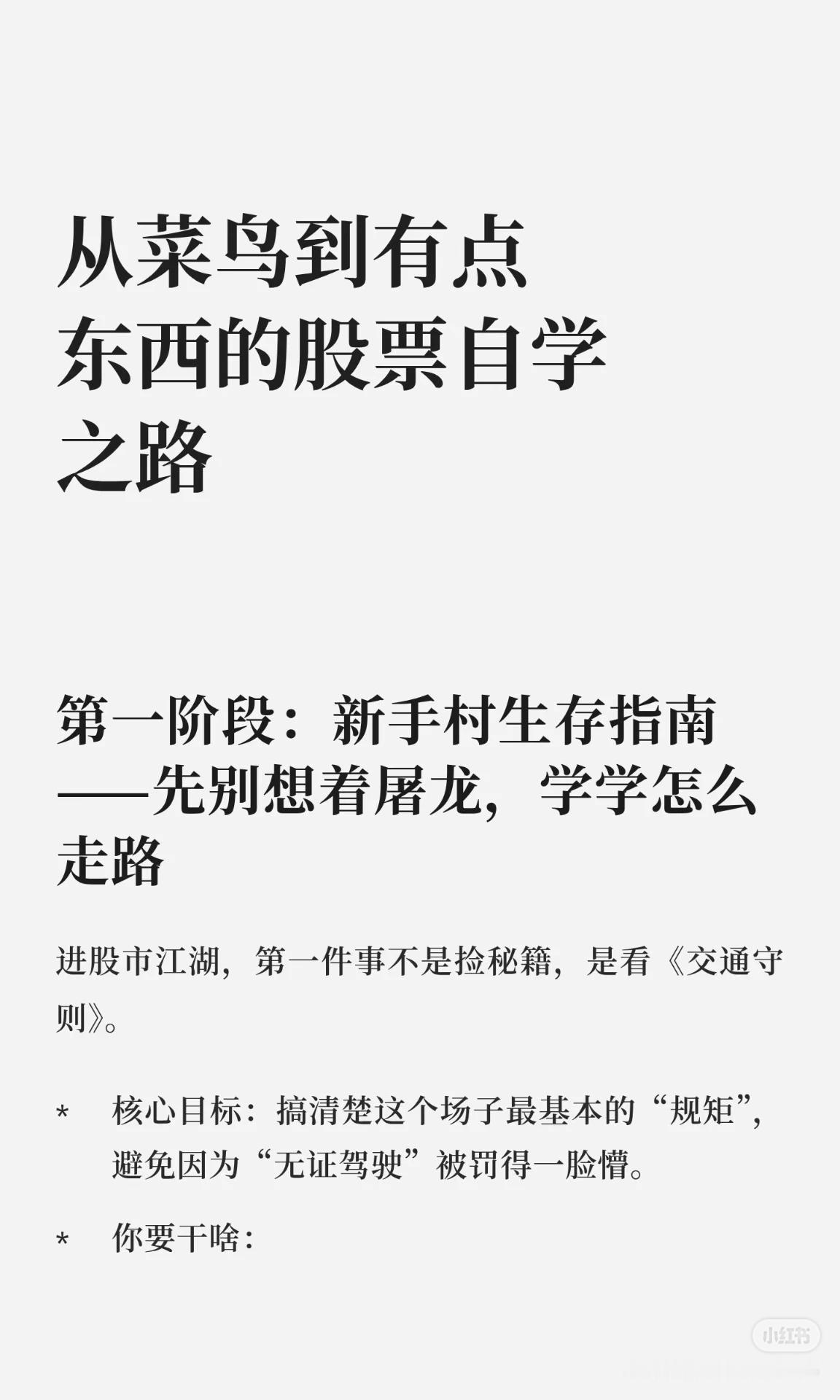 这套股票自学攻略分为 七个阶段 + 三条心法,帮助你从零基础成长为稳健的交易者: 新手村生存指南:先学规则和基础(交易时间、T+1、涨跌幅、ST、银证转账等),像考驾照科目一。 化身公司侦探:学会宏观、行业、财报分析,辨别潜力股与“滤镜股”。 看图说话:掌握K线、均线、MACD、RSI等技术指标,记住价格为主、指标为辅。 打造专属兵法:建立可执行的交易系统(研判、选股、买卖点、仓位管理)。 定期照镜子与升级:坚持复盘,管住贪婪与恐惧,形成稳定心态。 三条心法: 模拟盘多练,避免真金白银交学费。 精修少数核心指标,吃透即掌门。 复盘如刷牙,养成习惯,为钱包负责。 核心思想:先懂规则,再学分析,后建系统,终靠复盘与心态取胜。
