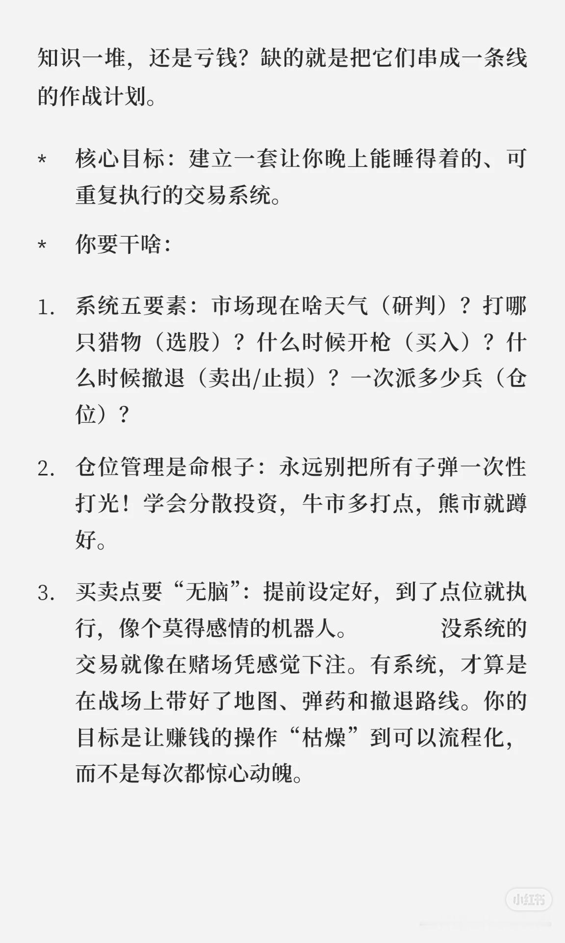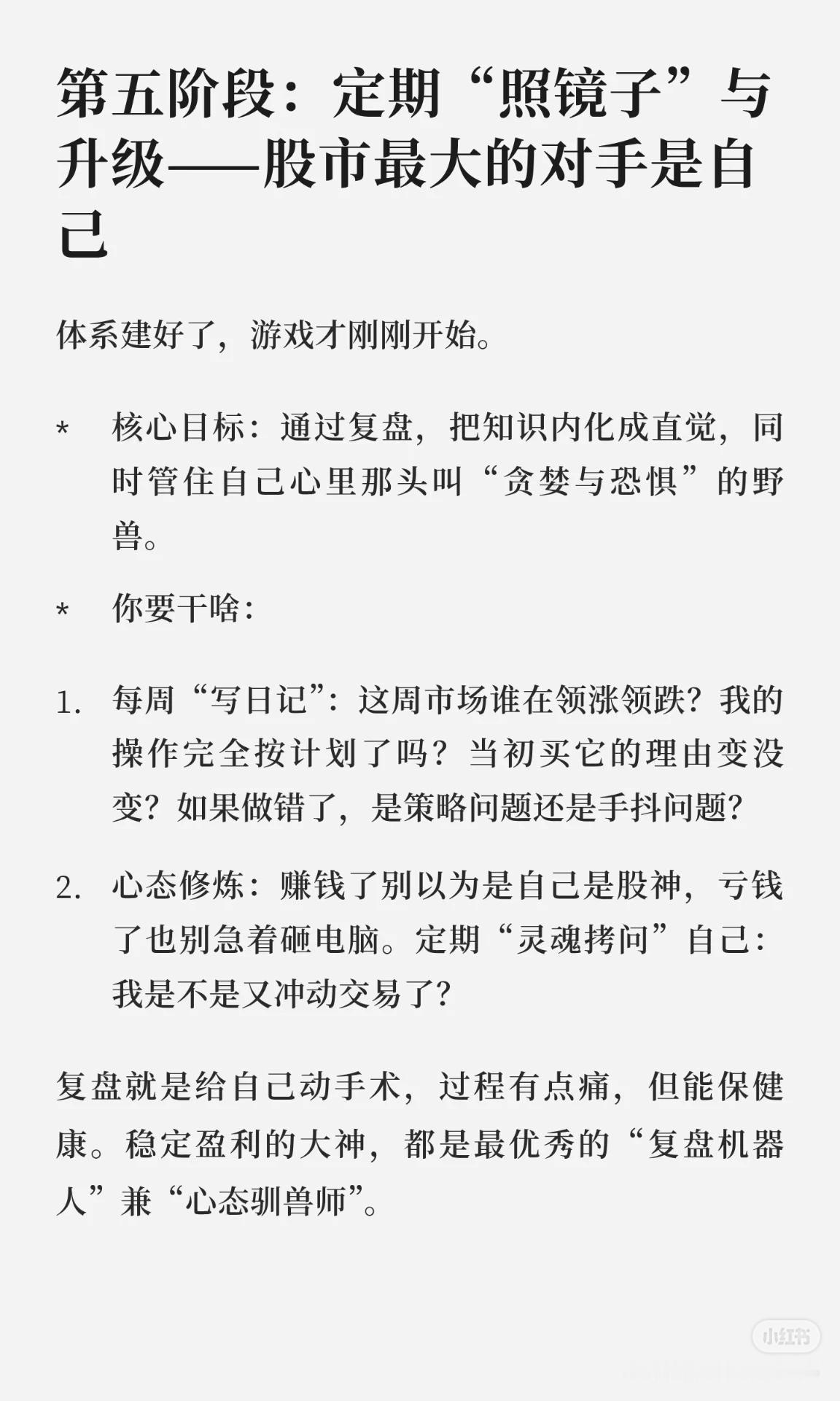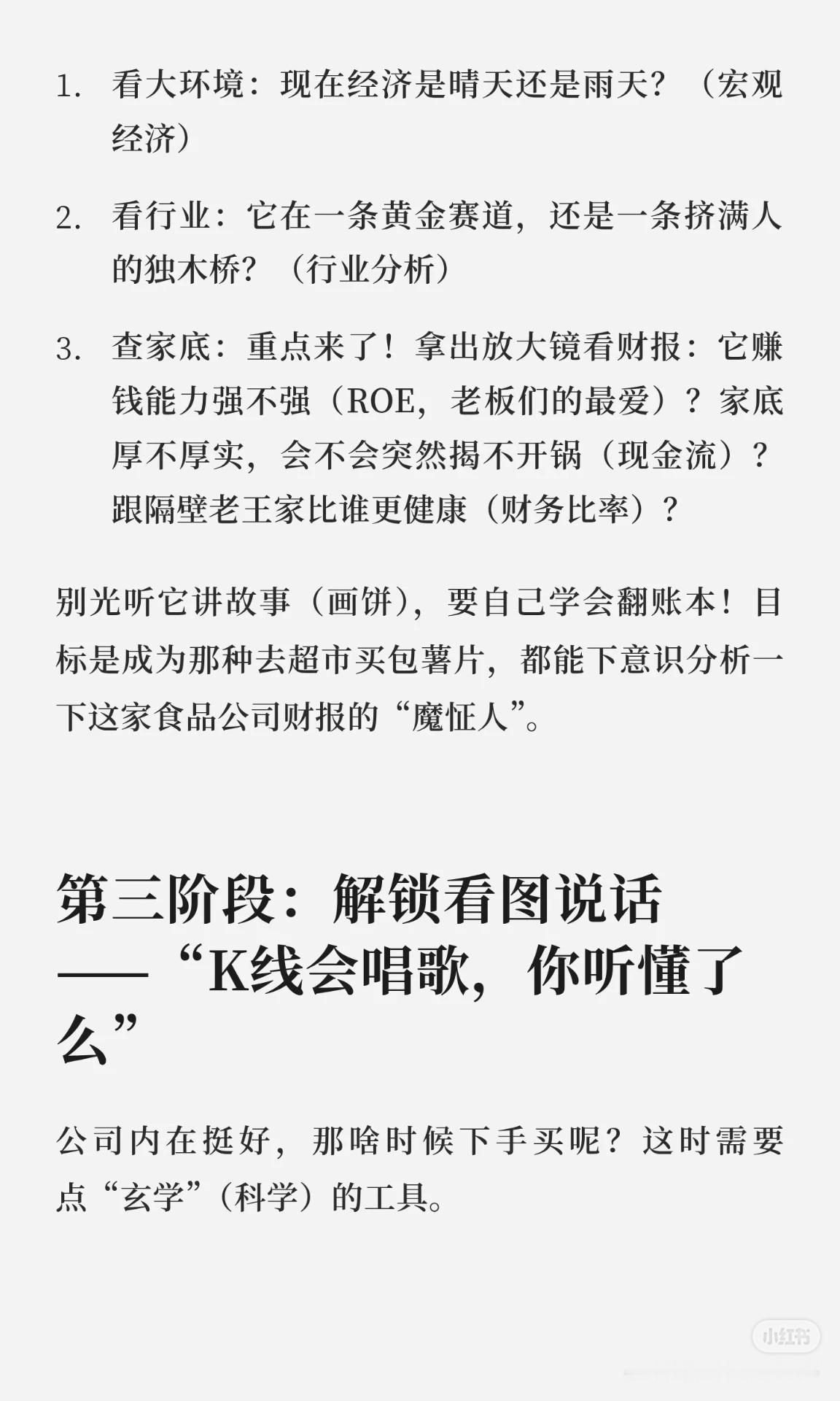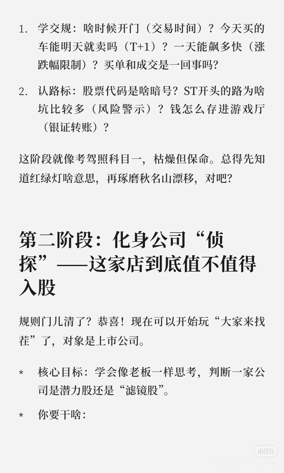 这套股票自学攻略分为 七个阶段 + 三条心法,帮助你从零基础成长为稳健的交易者: 新手村生存指南:先学规则和基础(交易时间、T+1、涨跌幅、ST、银证转账等),像考驾照科目一。 化身公司侦探:学会宏观、行业、财报分析,辨别潜力股与“滤镜股”。 看图说话:掌握K线、均线、MACD、RSI等技术指标,记住价格为主、指标为辅。 打造专属兵法:建立可执行的交易系统(研判、选股、买卖点、仓位管理)。 定期照镜子与升级:坚持复盘,管住贪婪与恐惧,形成稳定心态。 三条心法: 模拟盘多练,避免真金白银交学费。 精修少数核心指标,吃透即掌门。 复盘如刷牙,养成习惯,为钱包负责。 核心思想:先懂规则,再学分析,后建系统,终靠复盘与心态取胜。