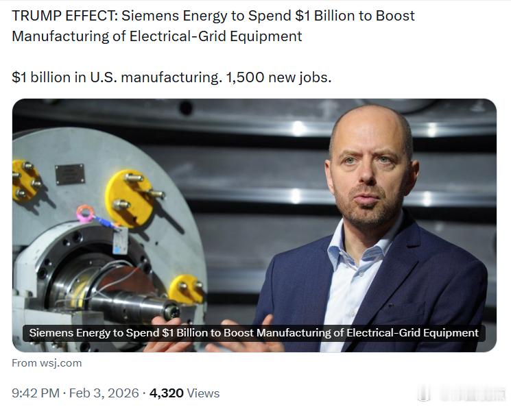 特朗普效应:西门子能源将投资10亿美元,扩大电网设备制造产能10亿美元投向美国制