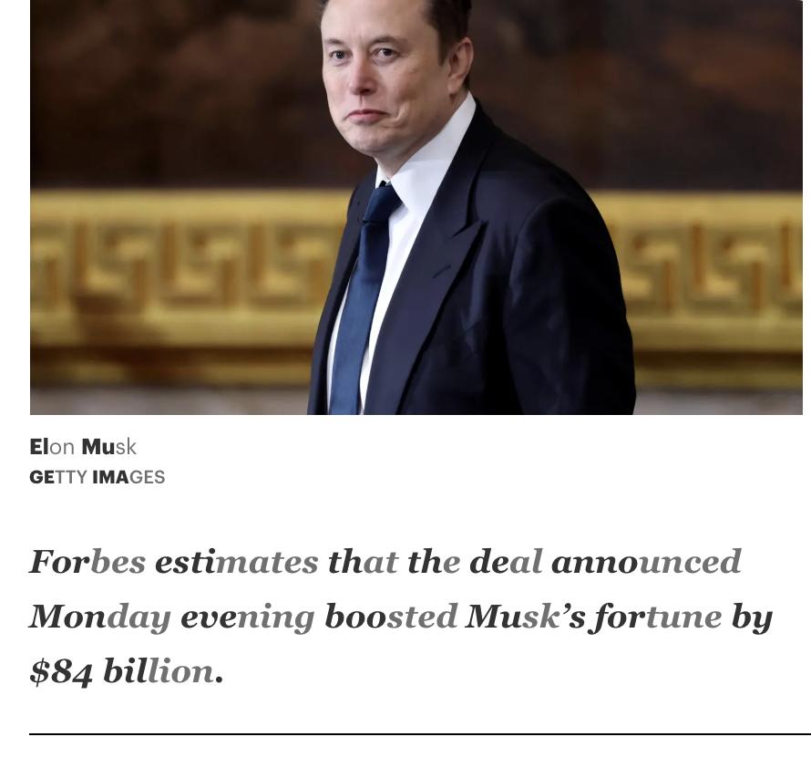 美媒:埃隆·马斯克在 SpaceX 收购其人工智能和社交媒体公司 xAI 后,净资产达到创纪录的 8520 亿美元,成为史上首位身价突破 8000 亿美元的人。 此次收购使 SpaceX 估值升至 1 万亿美元,xAI 估值 250 亿美元,马斯克在合并后公司持股 43%,价值 5420 亿美元。此前马斯克在 SpaceX 持有 42% 股份,价值 3360 亿美元;在 xAI 持有 49% 股份,价值 1220 亿美元。他还持有特斯拉 12% 股份,价值 1780 亿美元,以及 1240 亿美元的特斯拉股票期权。 若特斯拉达成未来 10 年市值增长八倍等“火星计划”里程碑,马斯克有望再获高达 1 万亿美元的股票奖励(税前)。