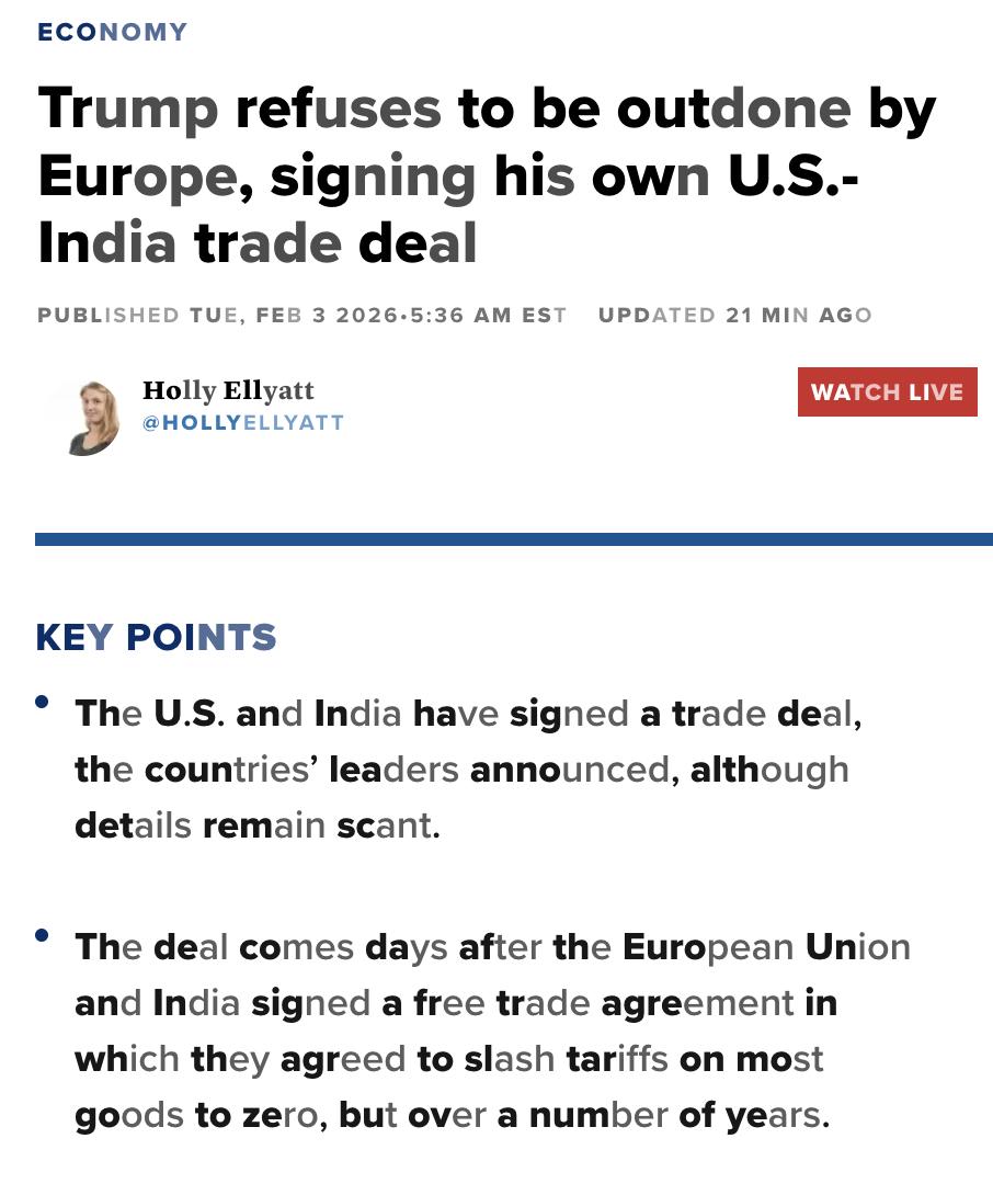 美媒:美国与印度达成贸易协定,特朗普在社交媒体上宣布美国将把对印度的主要关税从25%降至18%,并取消去年夏天因印度购买俄罗斯石油而加征的25%关税。 印度将停止购买俄罗斯石油,并购买超过5000亿美元的美国能源、技术、农业、煤炭等产品。该协定被视为对欧盟与印度达成自由贸易协定的回应,欧盟与印度的协定将在数年内逐步将大部分商品关税降至零。 尽管美国与印度的协定细节尚未公布,但分析人士认为这将提升印度的就业机会,同时增强美印战略关系。