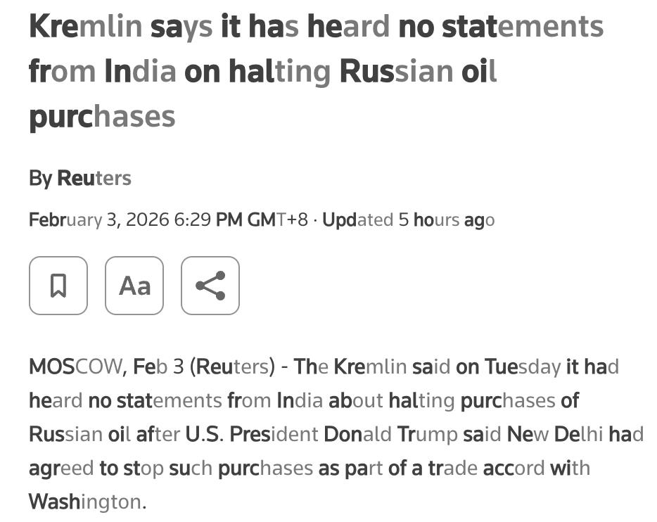 外媒:俄罗斯克里姆林宫表示,尚未听到印度关于停止购买俄罗斯石油的任何声明。此前美国总统特朗普宣布,印度已同意作为与华盛顿贸易协定的一部分停止购买俄罗斯石油,以换取美国将印度商品关税从50%降至18%。 克里姆林宫发言人佩斯科夫称,俄罗斯正在仔细分析特朗普关于美印关系的言论,并表示尊重美印双边关系,但俄罗斯与印度的战略伙伴关系同样重要,俄方将继续发展与印度的双边关系。 自2022年俄乌冲突爆发后,印度成为俄罗斯海上原油的最大买家,这一行为引发了西方国家的不满,因为西方对俄能源部门实施制裁,旨在减少俄罗斯的收入,削弱其战争资金来源。