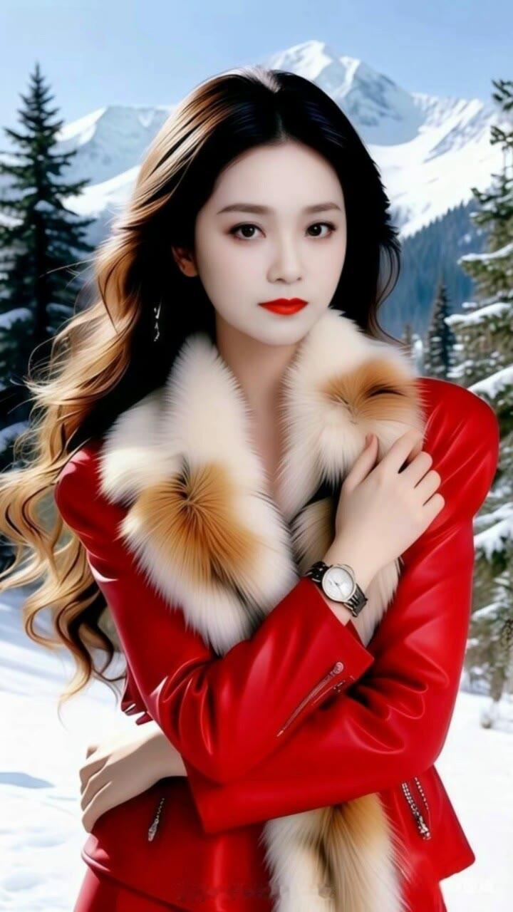 冬日雪景中的红衣美人,温暖而优雅。